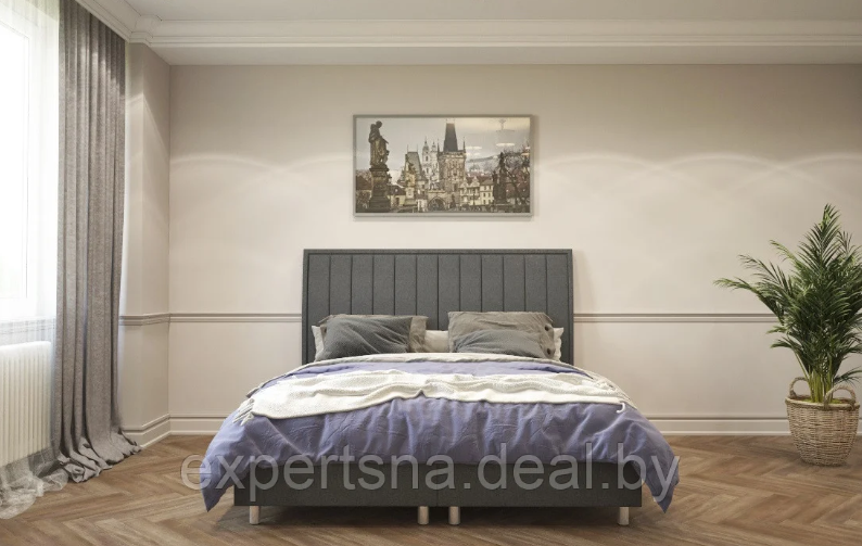 код 106340Высокое изголовье с вертикальной строчкой. Хромированные опоры. Большое спальное место.