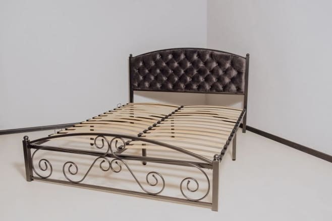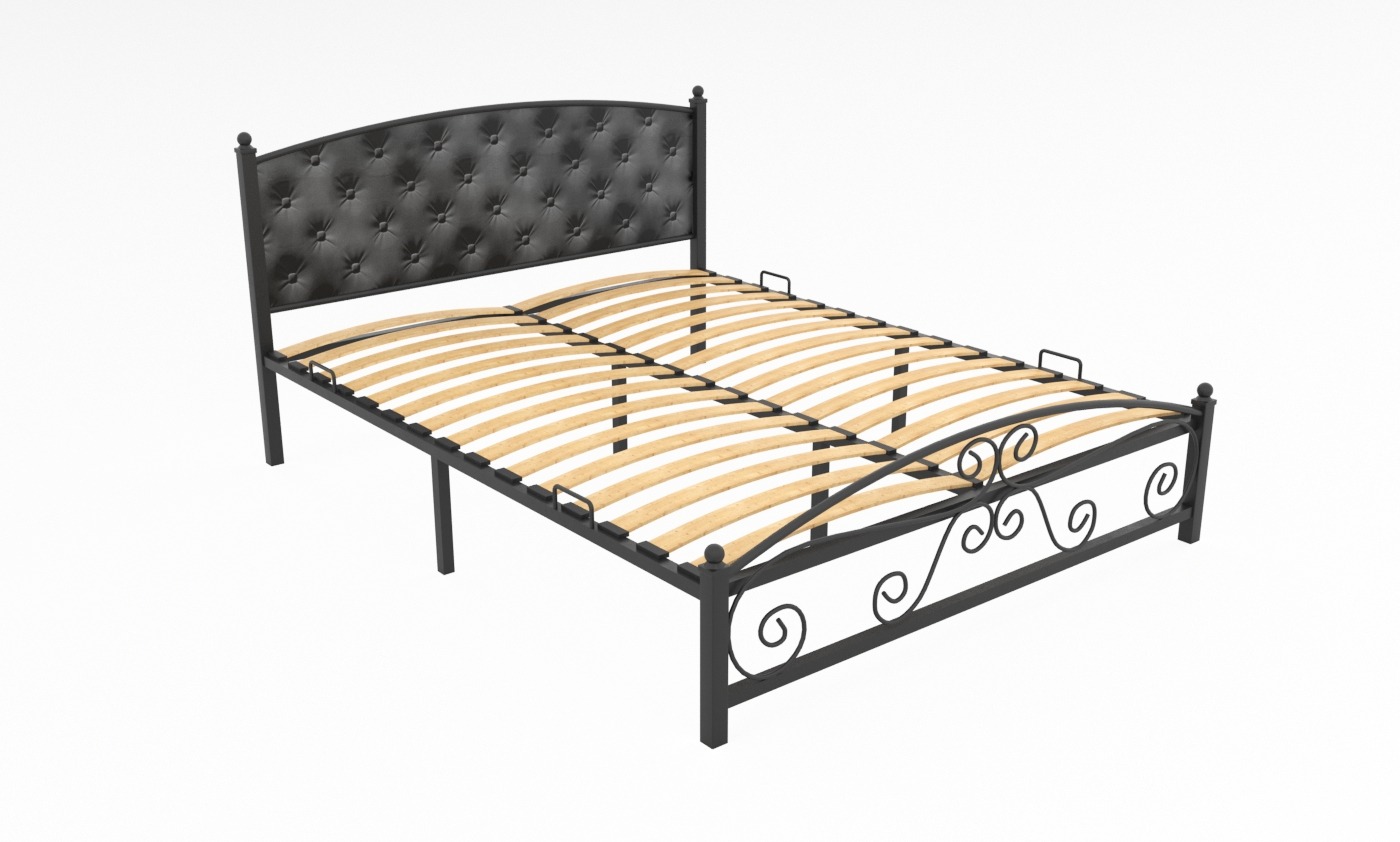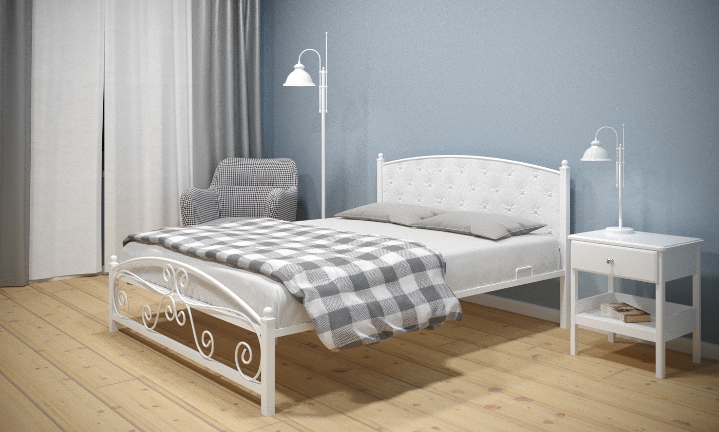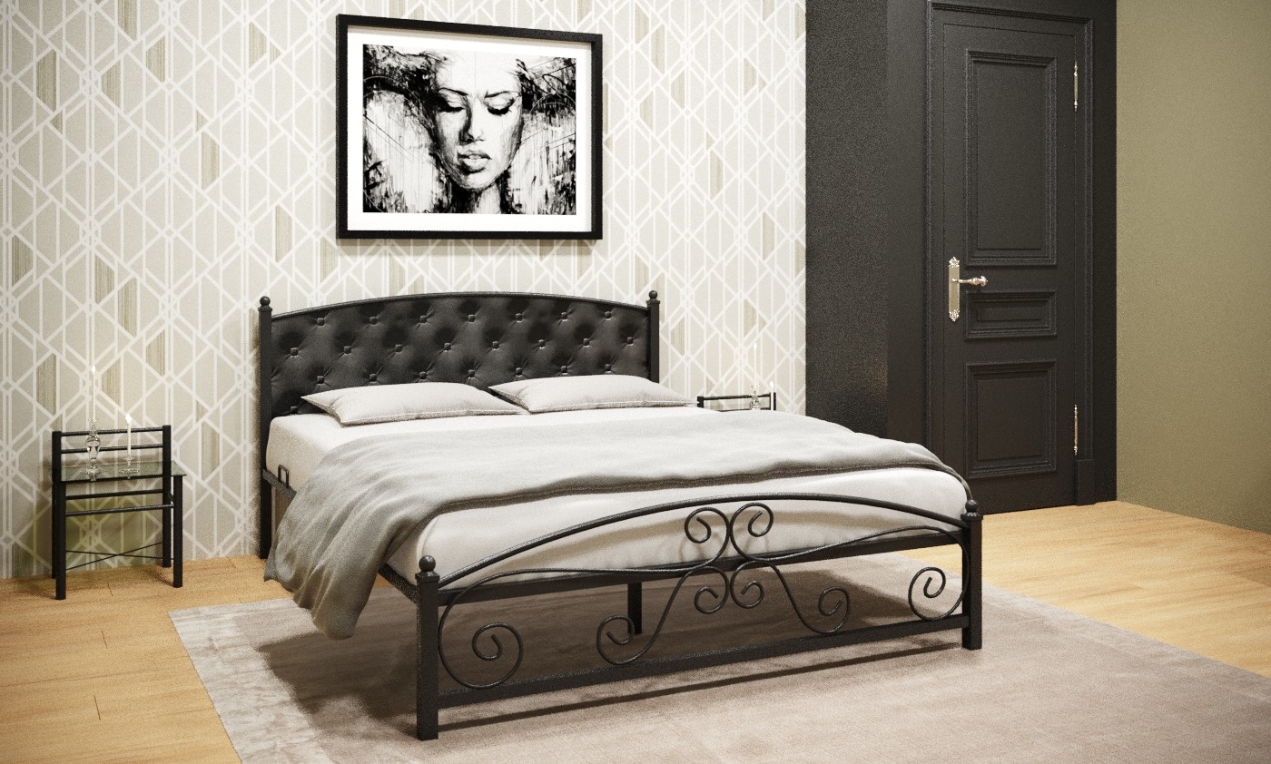 Кованая металлическая кровать Бали с мягким изголовьем — прекрасный выбор для комфортного сна. Особую неповторимость облику кровати придает каретная стяжка изголовья и декоративные элементы изножья.