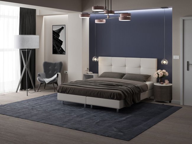 Модель комплектуется основанием Boxspring Lift с подъемным механизмом. Это поможет вам сэкономить место в спальне, так как основание оснащено вместительным пространством для хранения постельного белья, одежды и прочих принадлежностей. 2 усиленные металлические решетки на 4 газовых лифтах (только для размеров 160-200 см) подойдут для матрасов разной жесткости. В основаниях шириной 80-140 см установлена одна металлическая решетка с 2 газовыми лифтами. Ножки выполнены из металла цвета хром, круглого сечения. Односпальный размер основания (80/90/100 см) имеет систему крепления между собой.