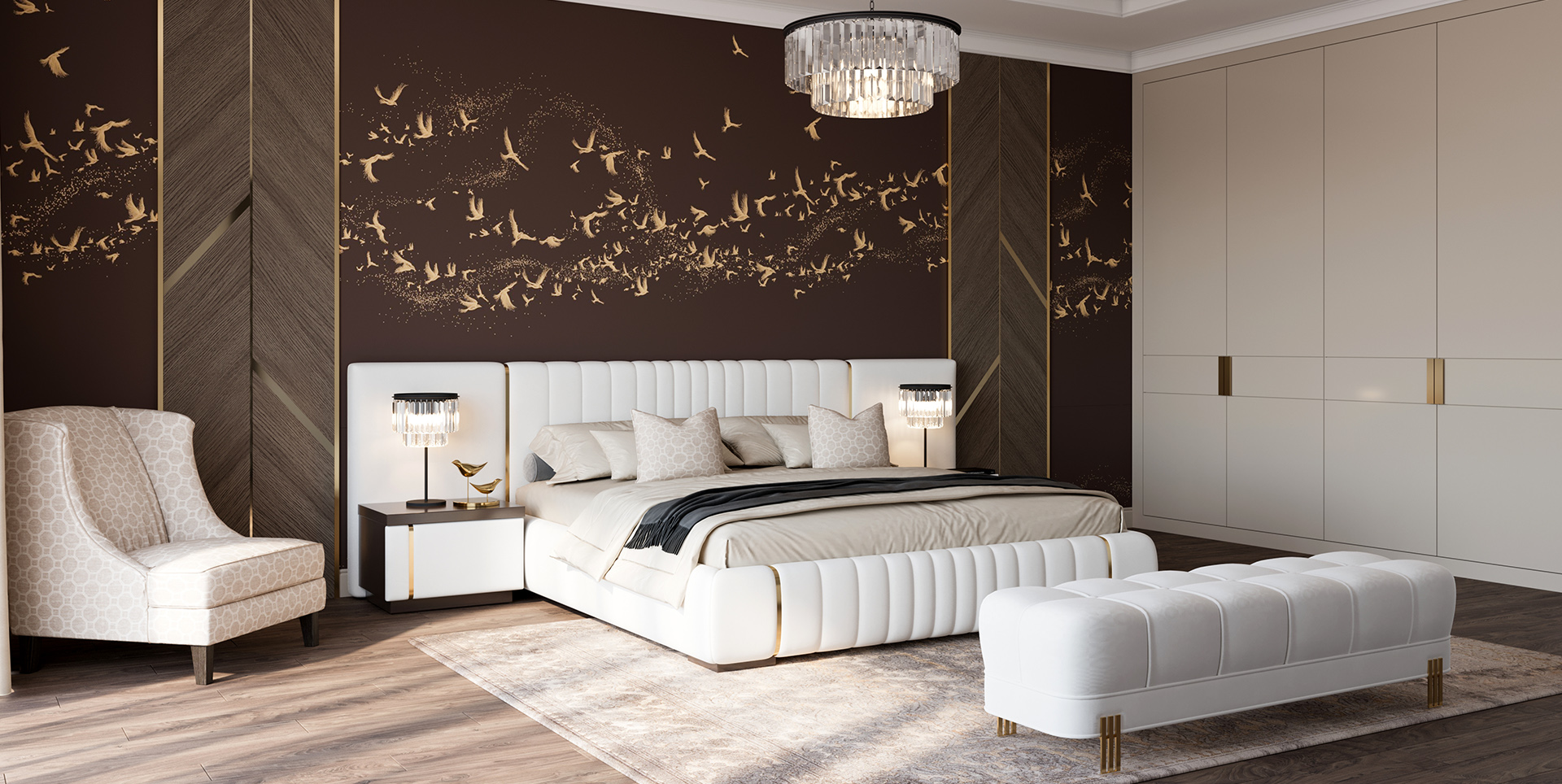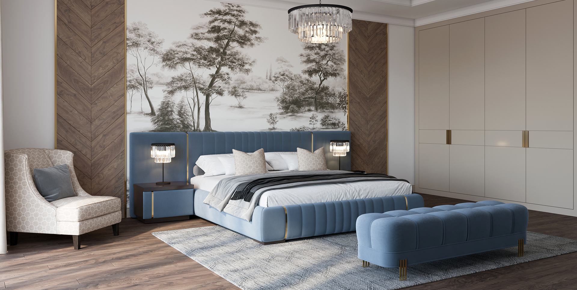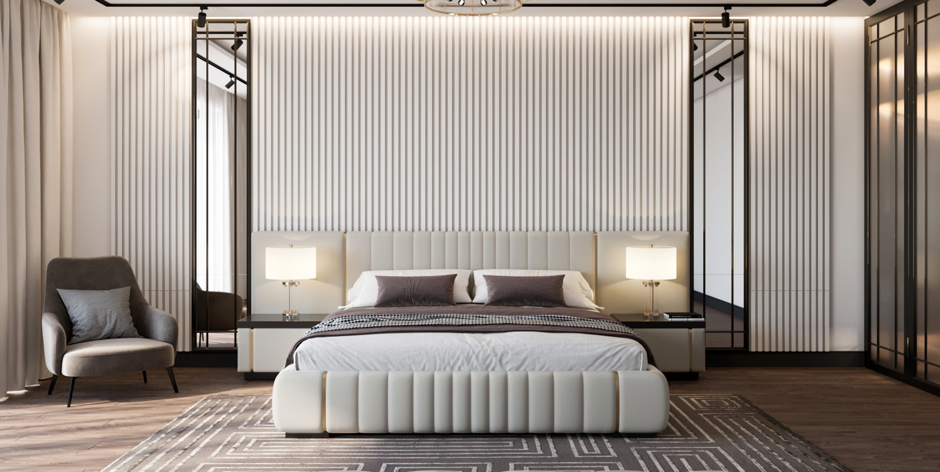 Кровать Bliss-2 (A1) отличается широким мягким изголовьем, украшенным вертикальными строчками, симметрично расходящимися от центра к краям спинки. Металлические молдинги шириной 40мм, дополнительно интегрированные в спинку по бокам, повторяются в отделке передней панели кровати. По желанию кровать может быть изготовлена как с вместительным коробом для белья и подъемным механизмом, так и без них.