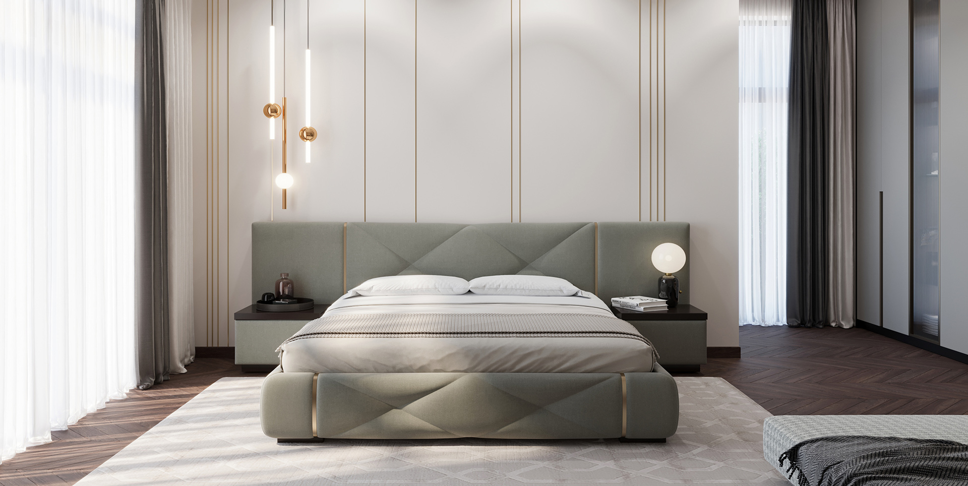 Высокое мягкое изголовье кровати Bliss-2 (A4) эффектно украшено двумя Х-образными утяжками с декоративной строчкой, завершенными по краям металлическими вставками. Аналогичный уменьшенный узор продублирован на передней панели и усиливает эффектный дизайн кровати. Модель изготавливается в вариациях с коробом для белья и без него. Основание кровати установлено на невысоких опорах, которые могут быть, как из дерева, так и из металла в цвет декоративных вставок. Цвет металла можно выбрать на свой вкус в оттенках золота, латуни, меди и стали.