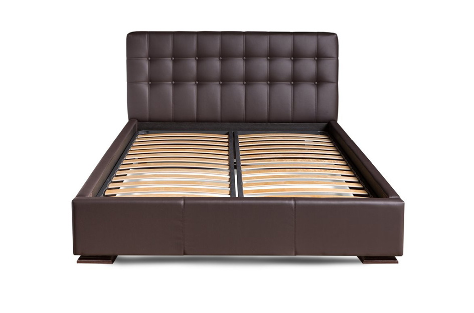 Кровать «Бонд» изготовлена из древесного массива, ДСП и мягкой обивки из экокожи. В комплектацию входит основание с подъемным механизмом и ниша для хранения.
