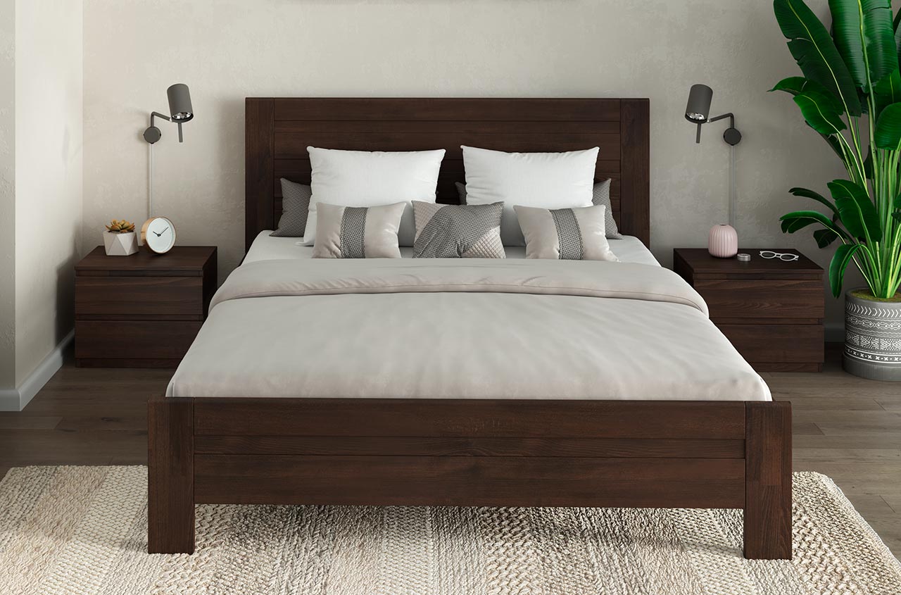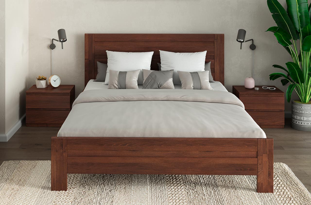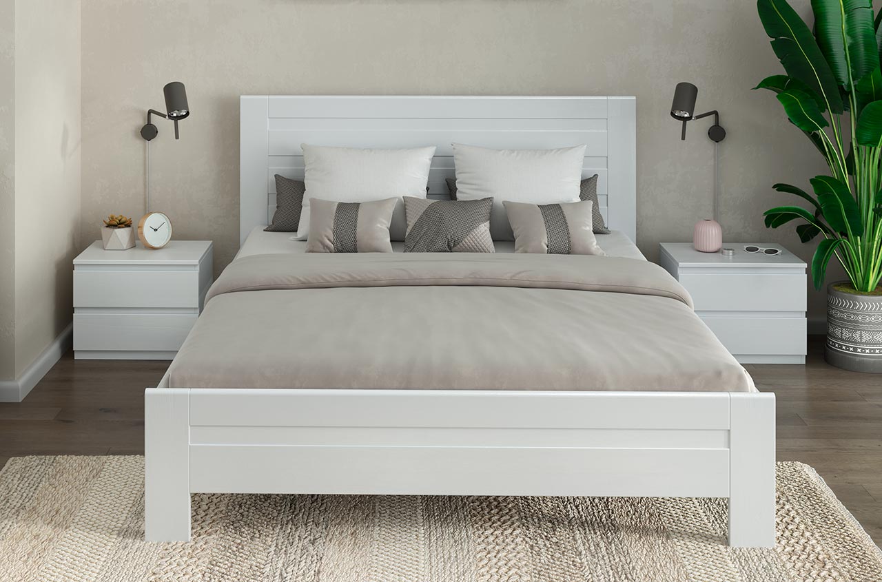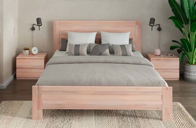 - Кровать из древесины бука (массив + щит), покрытой льняным маслом или акриловой краской.
