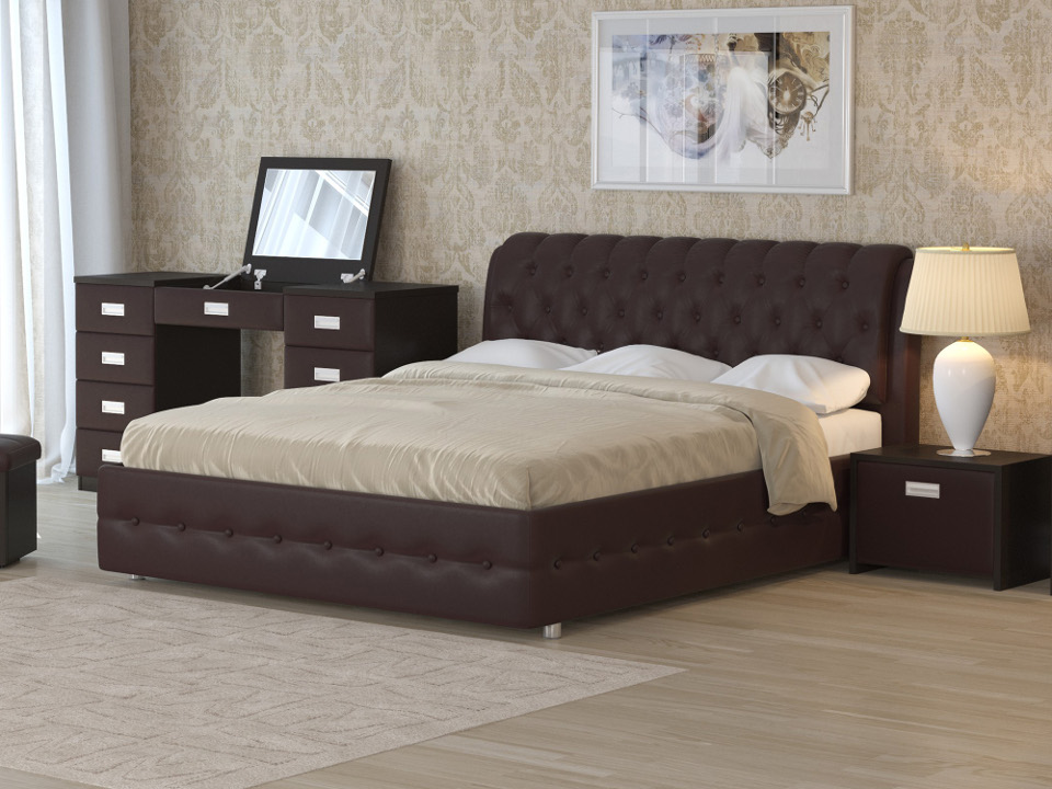 Модель изготовлена из ДСП. Царги кровати выполнены из ДСП, спинка из фанеры. Обивка кровати может быть выполнена из экокожи класса «люкс» или из мебельной ткани, в т.ч. задняя стенка.