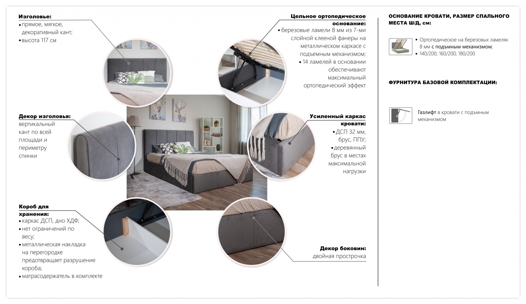 Спальное место: 120/140/160/180x200 см. Ортопедическое основание с подъемным механизмом.