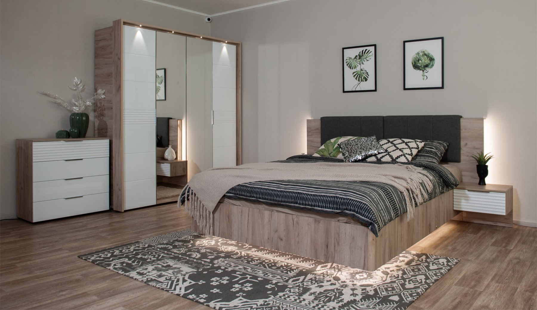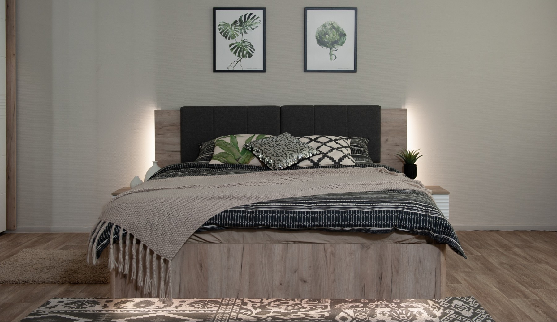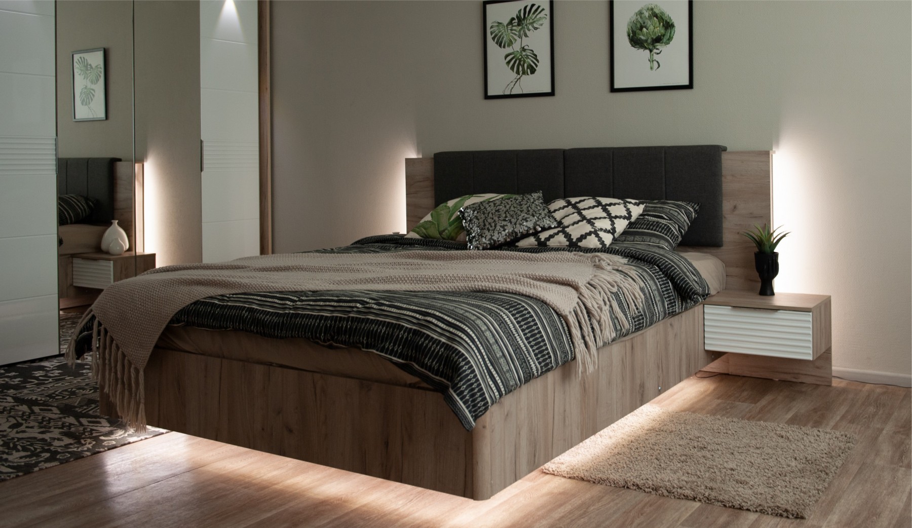 Спальное место: 180х200 см. Материал: МДФ покрытый плёнкой, ЛДСП.