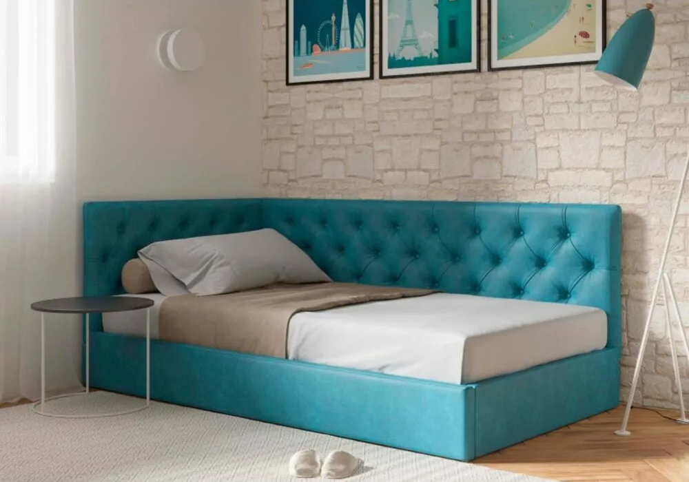 код 132205Кровать Юнис - стильная кровать с мягким изголовьем и спинкой. Ниша для белья. Большой выбор тканей.