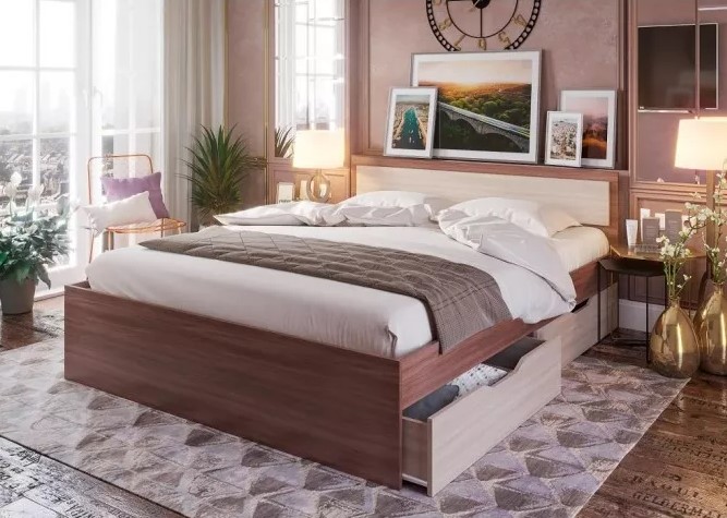 Спинка оборудована тумбочками для часов, светильников. На полках подиума можно хранить вещи.