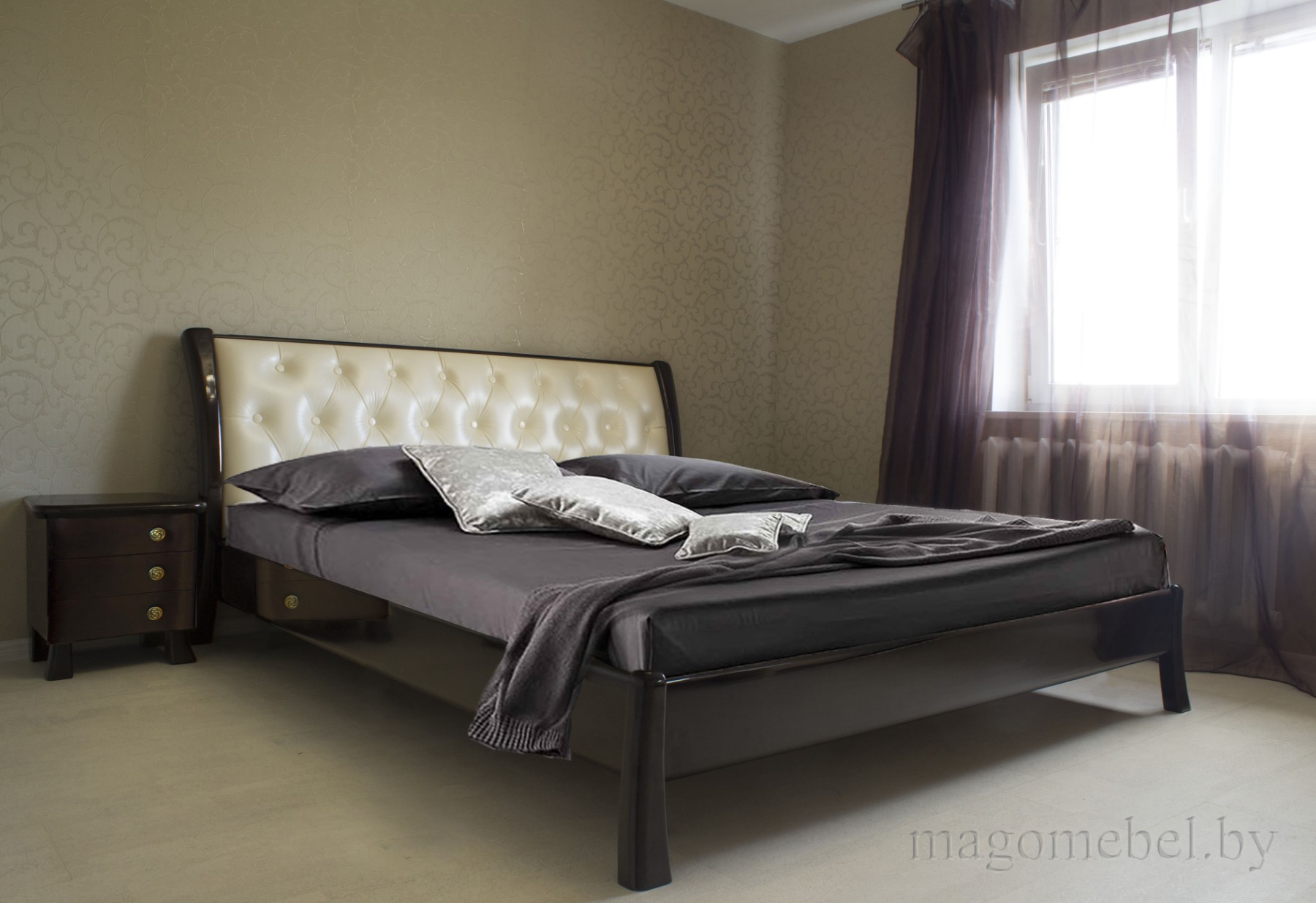 Двуспальная кровать с ортопедическим основанием и мягким изголовьем.