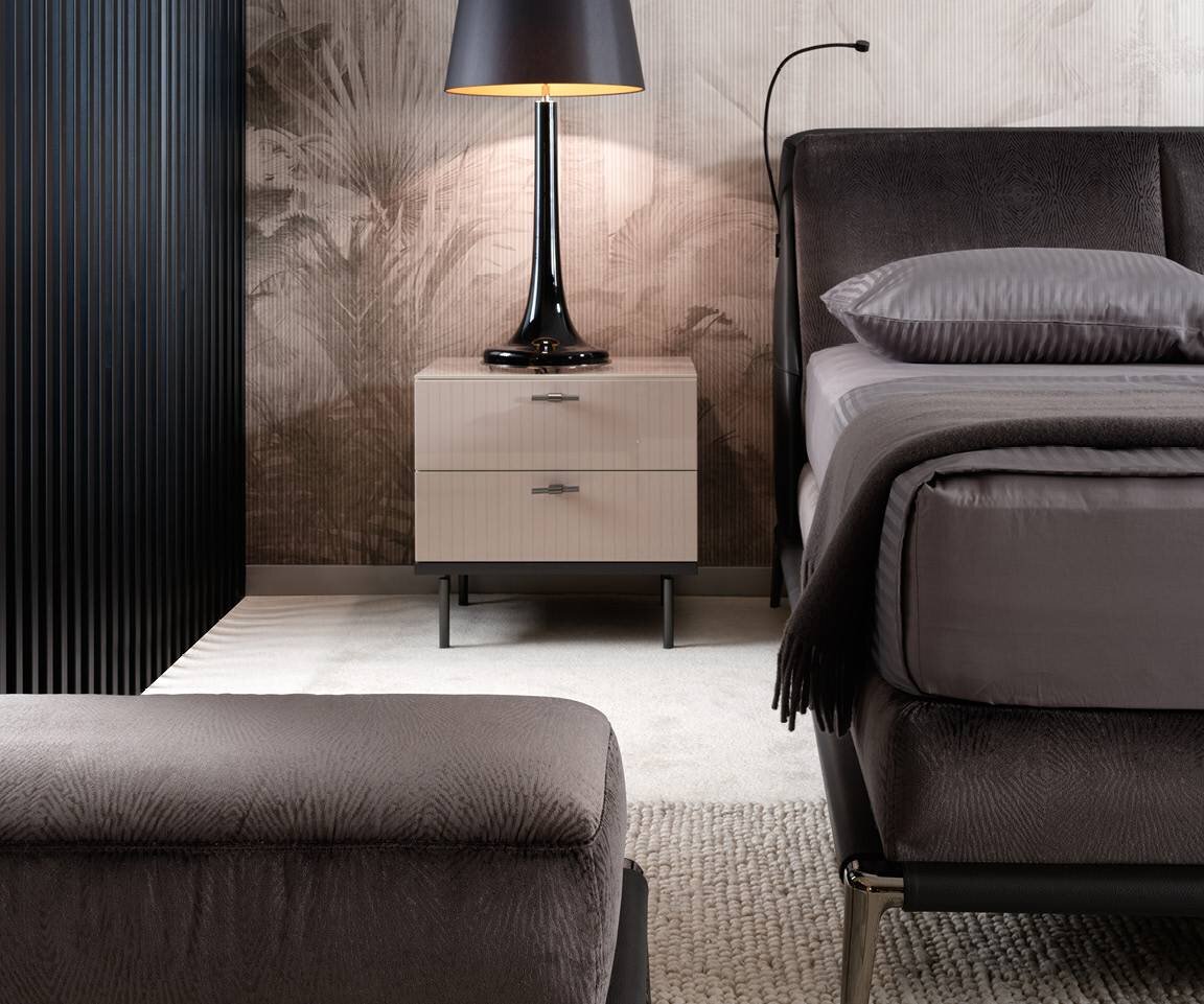 Невероятно удобная континентальная кровать с высоко расположенным матрасом – такое положение позволяет легко вставать. Изголовье кровати (задняя часть может быть обтянута кожей) обито двумя большими мягкими подушками, слегка откинутыми назад. Тонкая платформа, на которой располагаются комод и матрас, также может быть обтянута кожей; металлические ножки, приподнимающие её, придают кровати лёгкость и изящество.