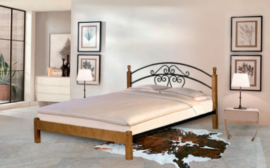 Размер на выбор заказчика. Каркас из металла и массива березы светлой расцветки. Округлое изголовье декорировано ковкой с легким завитушным узором в стиле модерн.