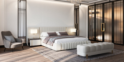 Мягкая кровать с двумя разными высокими изголовьями, которые создают иллюзию глубины.