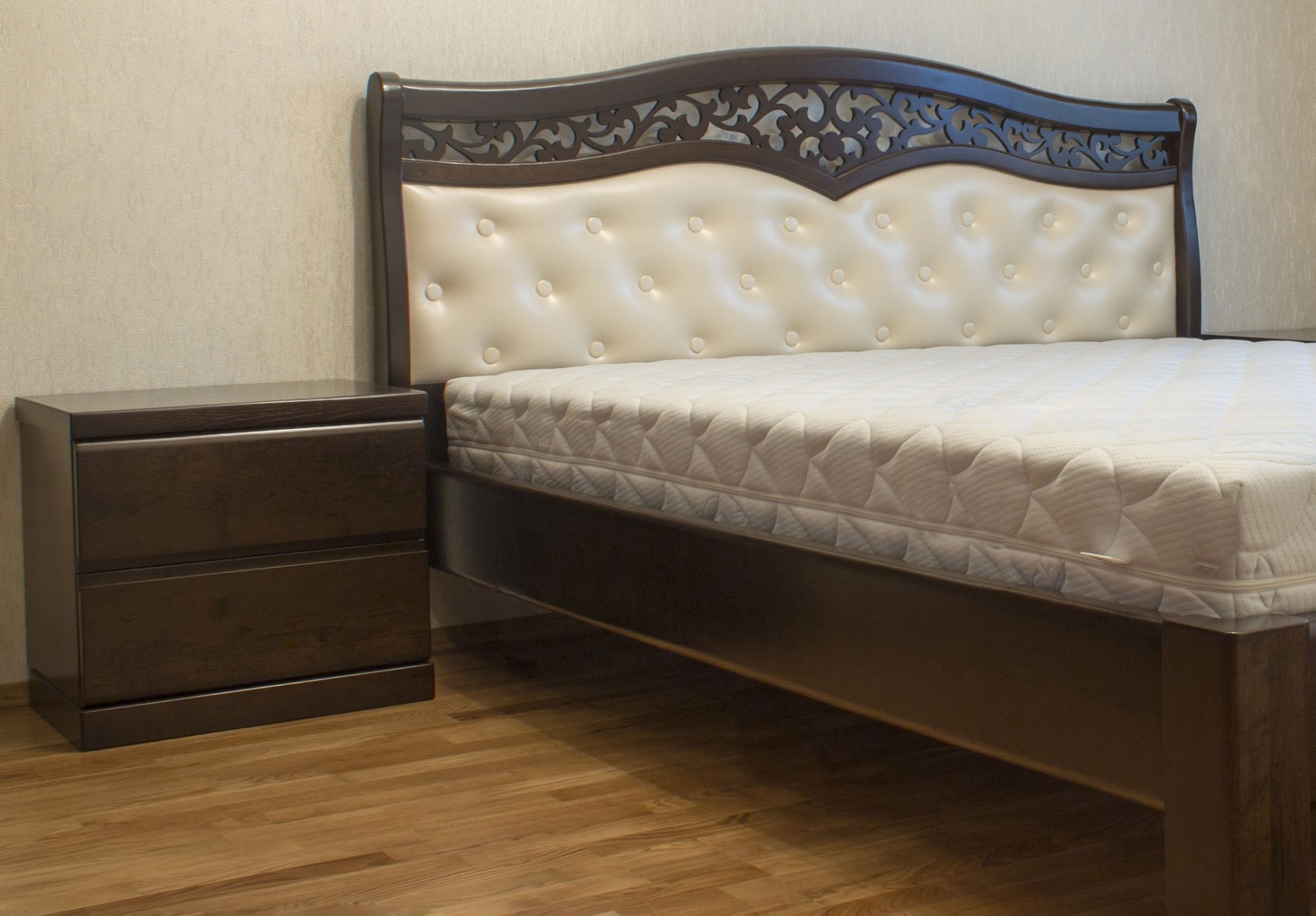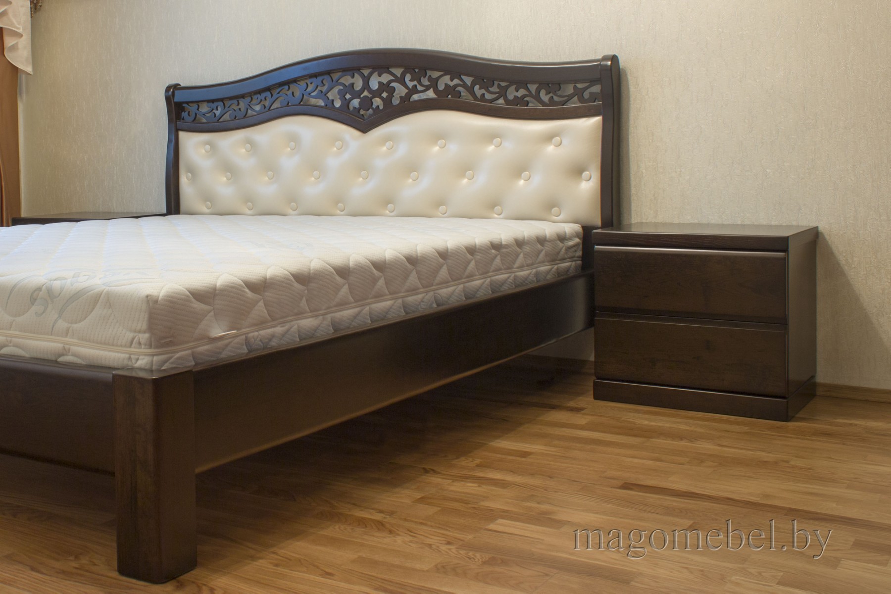 Двуспальная кровать с ортопедическим основанием и мягким изголовьем.