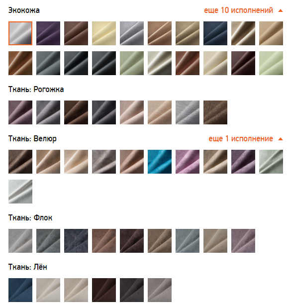 Используемые материалы – ДСП, МДФ, обивка выполнена из экокожи класса «Люкс» или из мебельной ткани. Широкий выбор цветовых решений – от классических до весьма необычных – позволит каждому найти вариант себе по вкусу.