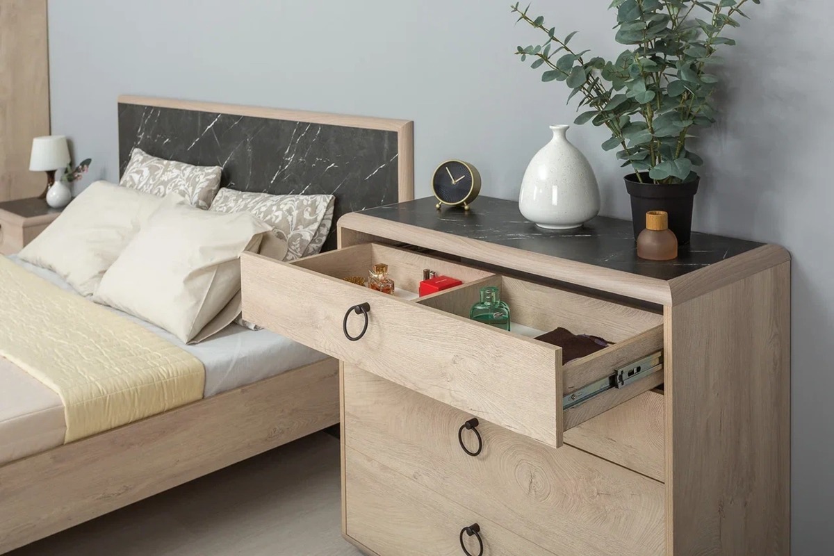 Мягкое сочетание элегантной структуры дуба с белым и чёрным мрамором создаёт атмосферу лёгкости, прохлады и чистоты. Образ дополняется металлическими ручками-кольцами и высокими хромированными опорами.