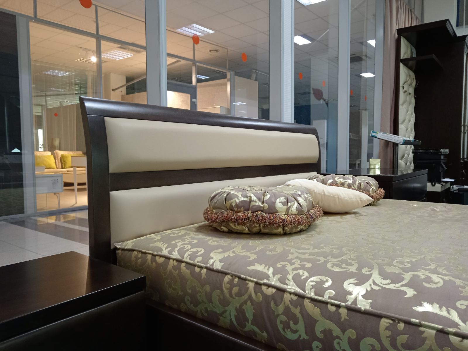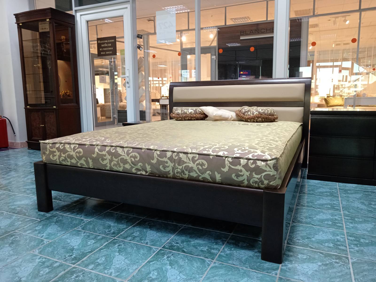 Двуспальная кровать с ортопедическим основанием и мягким изголовьем.