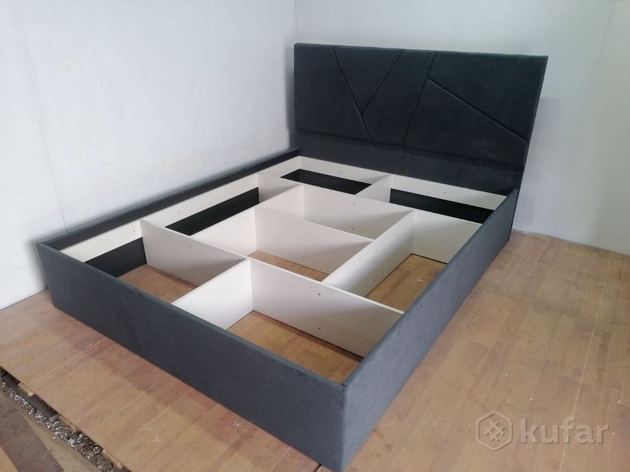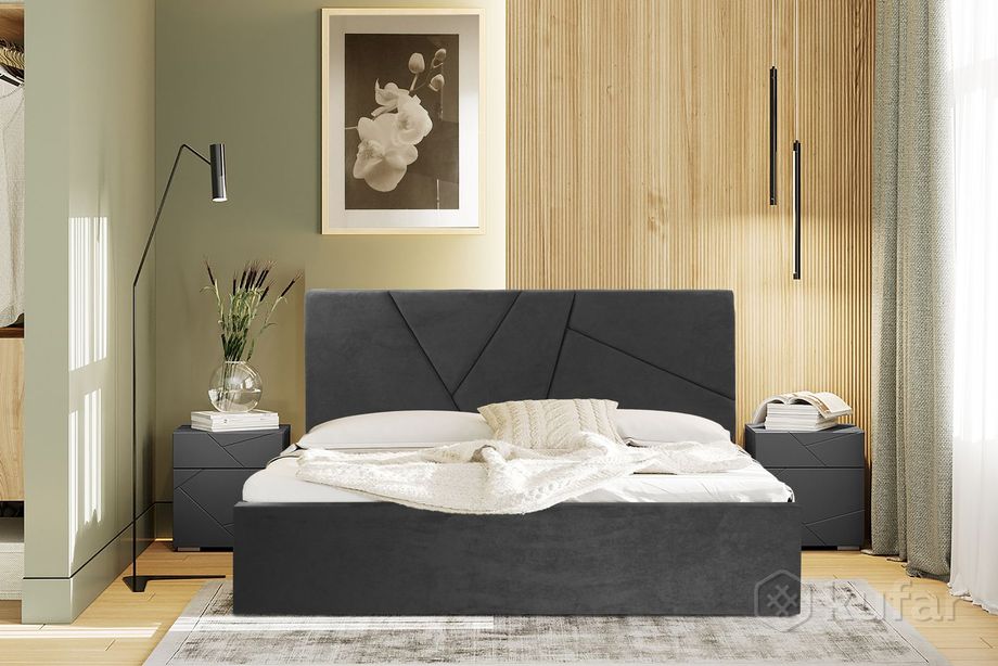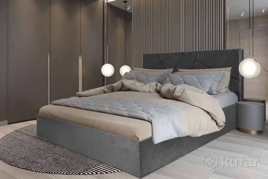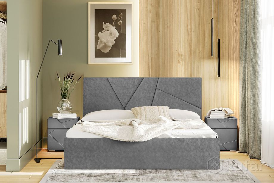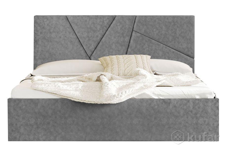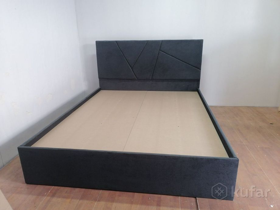 код 148973Современная и практичная кровать с мягким изголовьем и обивкой из ткани по всему периметру.