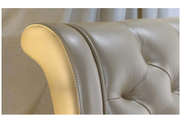 Обивка из натуральной кожи и слегка изогнутая спинка, добавляют модели дополнительного лоска и изыска.