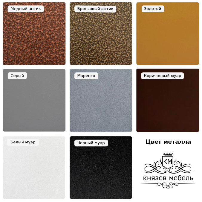 Цвет металла: Белый муар, Бронзовый антик, Золотой, Коричневый муар, Маренго, Медный антик, Серый, Черный муар.