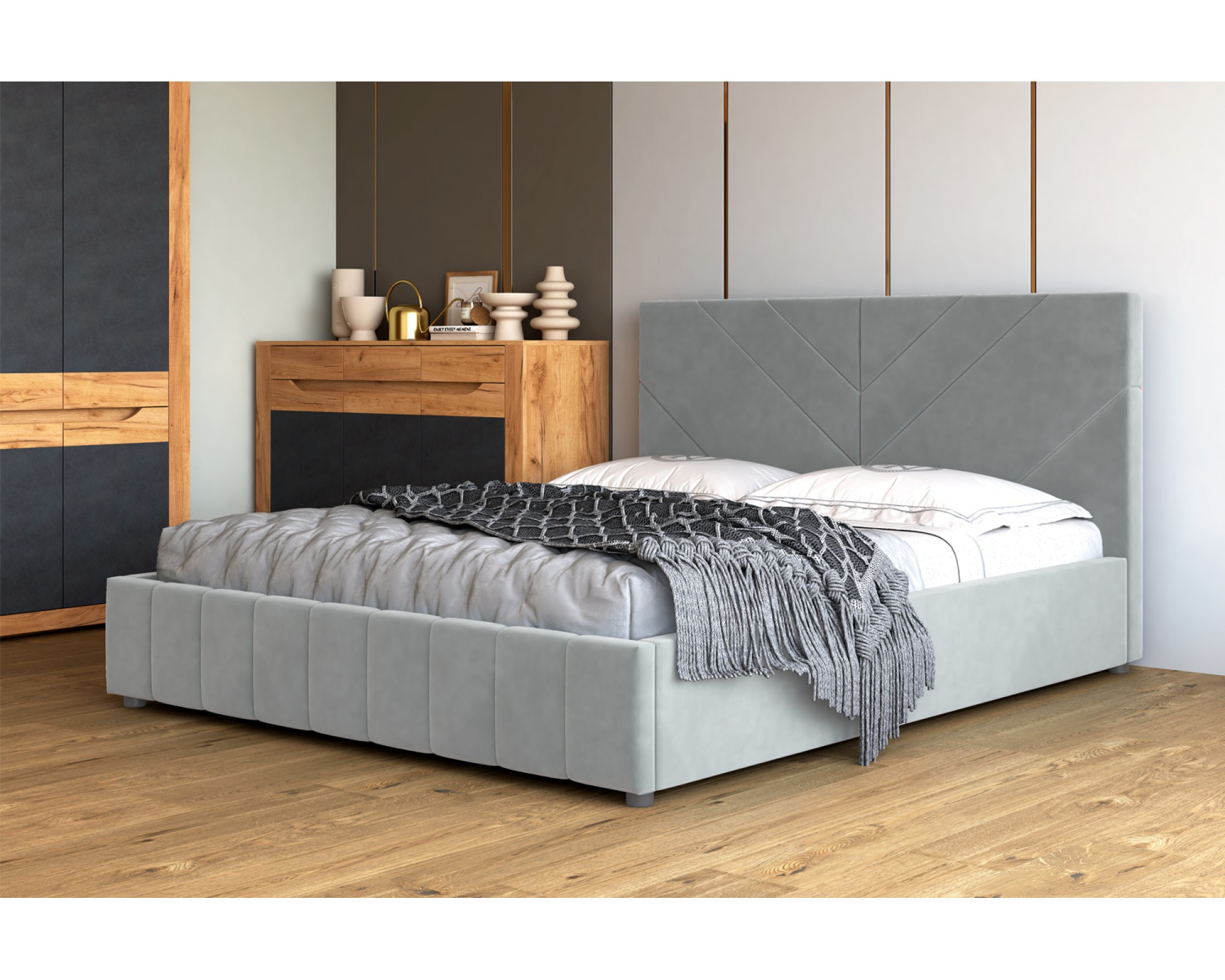 Современная двуспальная кровать серого цвета