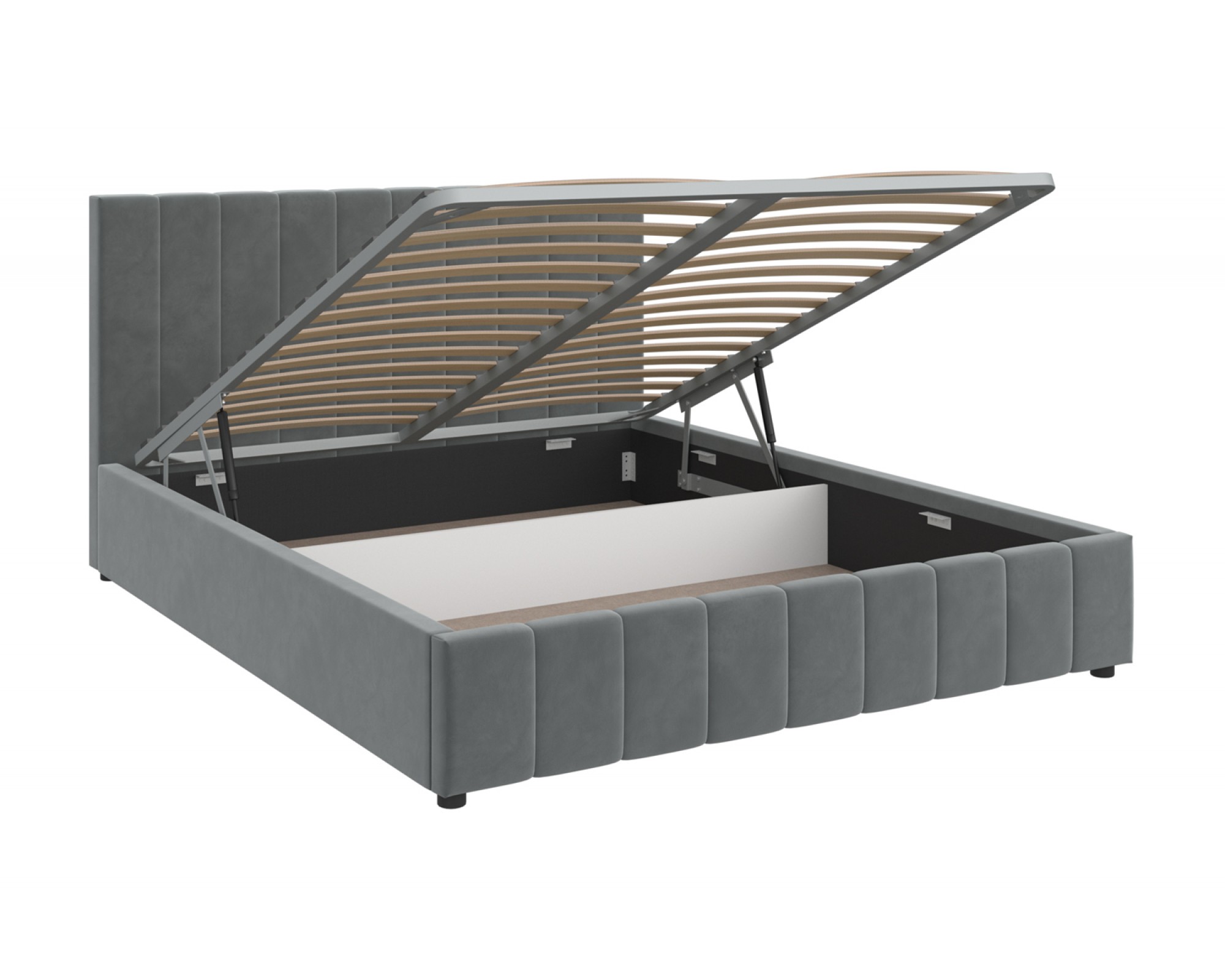 Интерьерная кровать НЕЛЬСОН (Вертикаль) комплектуется металлокаркасным основанием (вариант 1) или металлокаркасом с подъемным механизмом с газовым амортизатором (газлифтом) (вариант 2). В случае выбора 2-го варианта основания спального места в кровати будет находиться вместительный бельевой ящик.