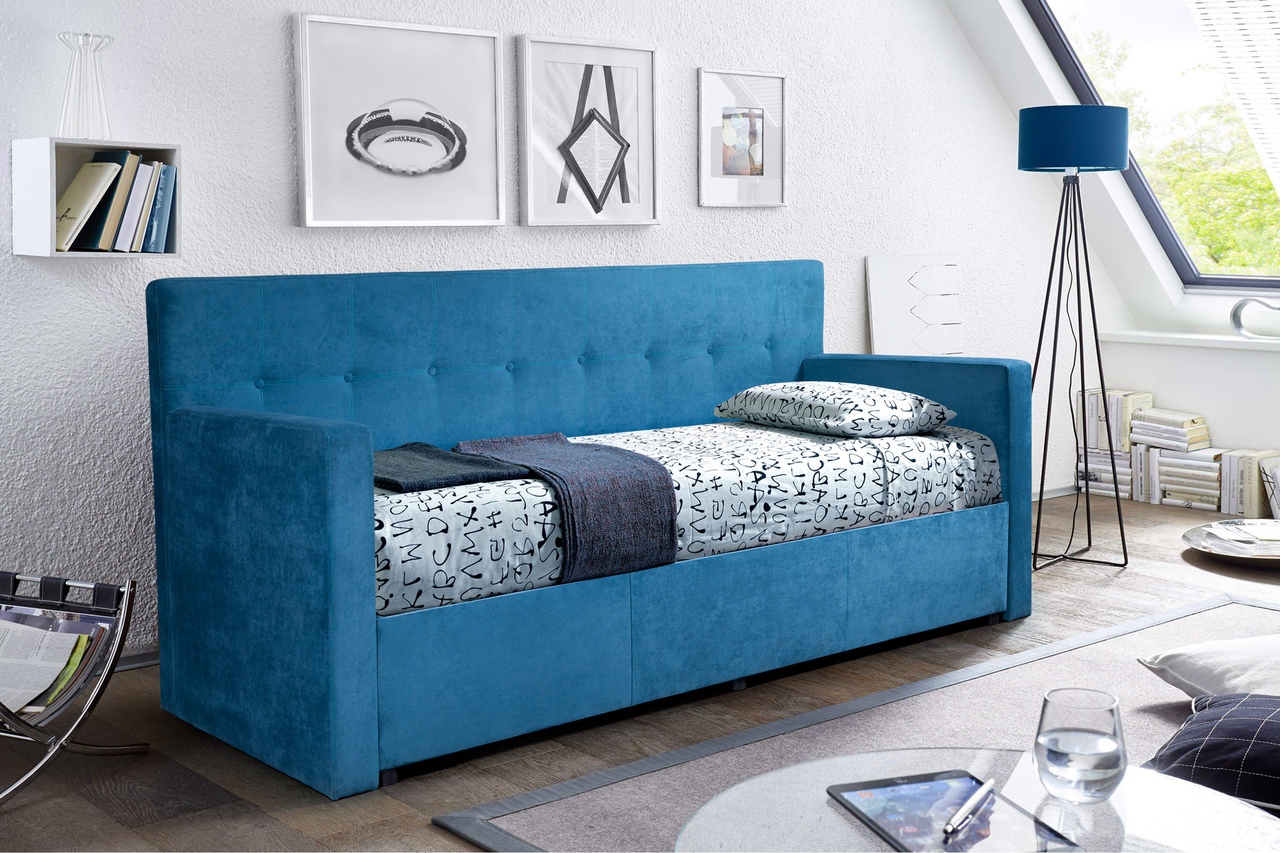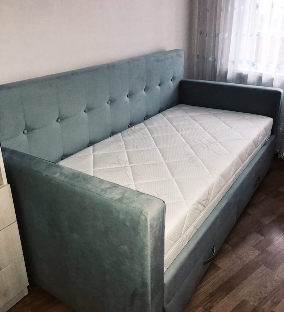 код 129354Современная односпальная кровать с мягкой спинкой и подлокотниками.