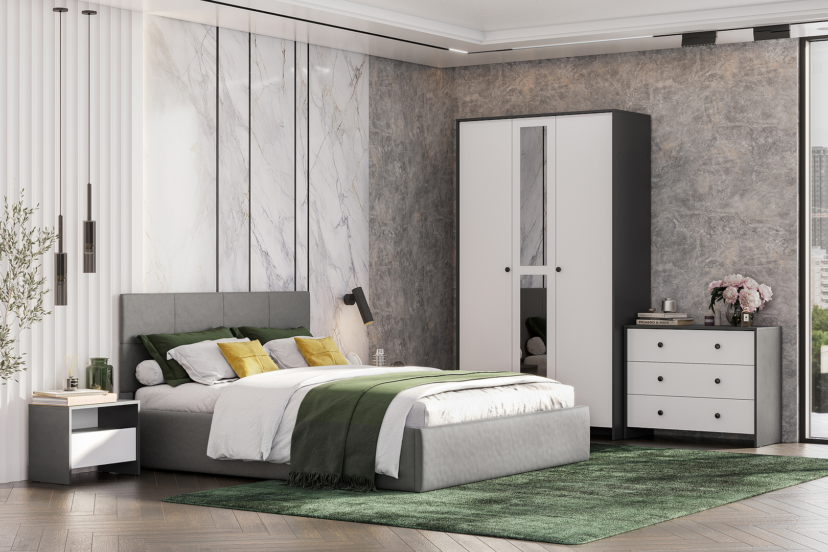 Спальное место: 160x200 см. Материал: ЛДСП, МДФ.