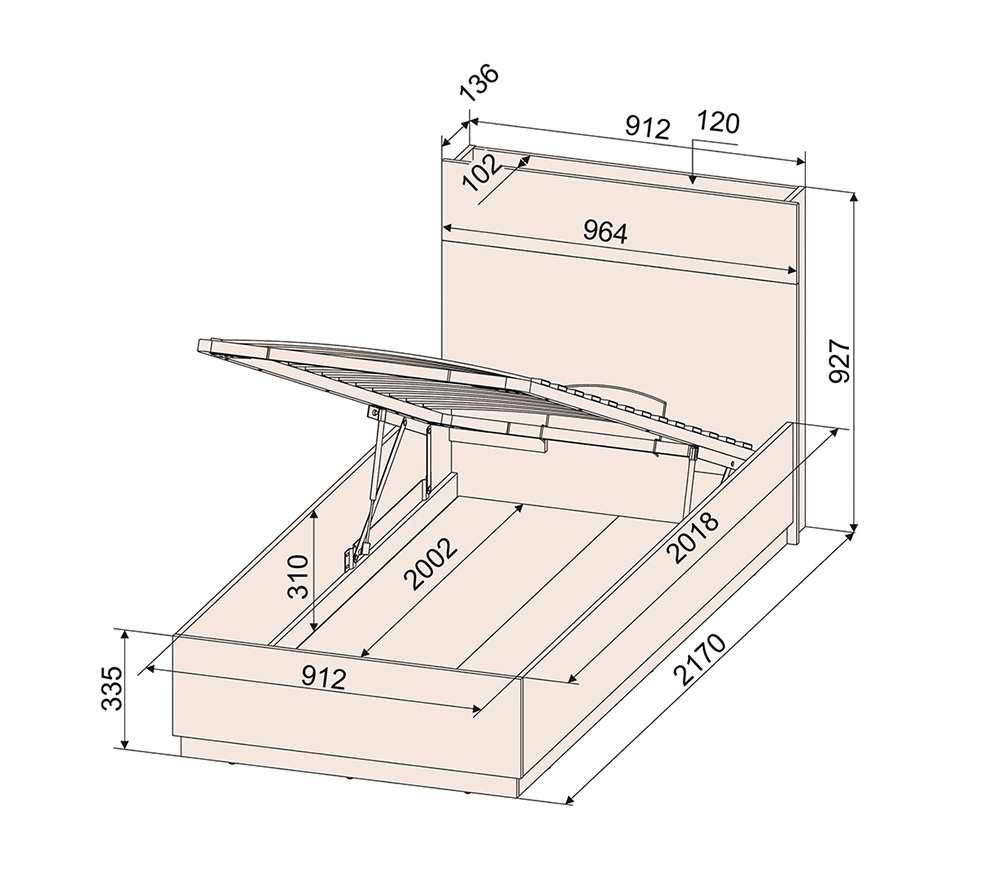 код 124300Кровать односпальная с полкой в изголовье. Подъемный механизм.