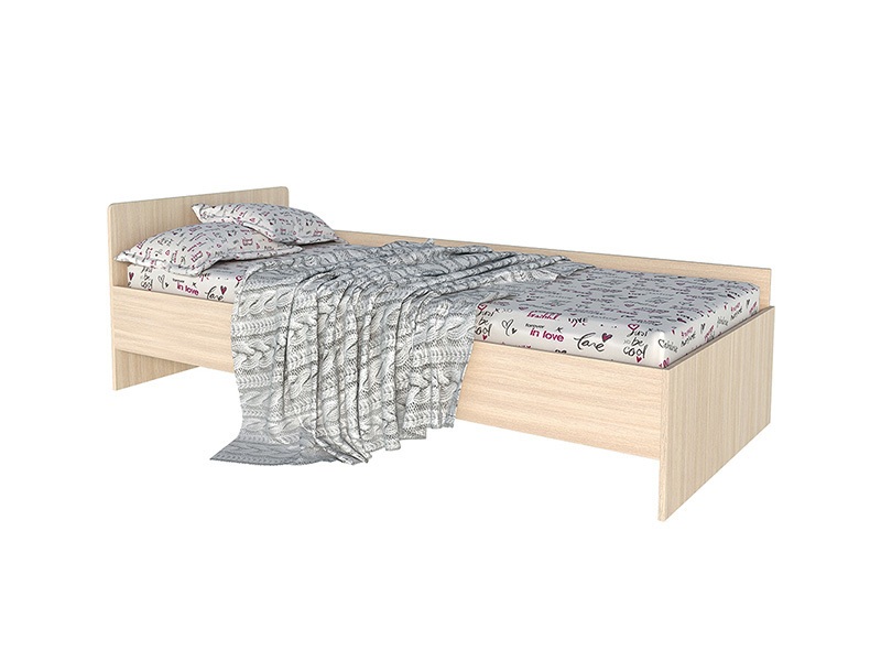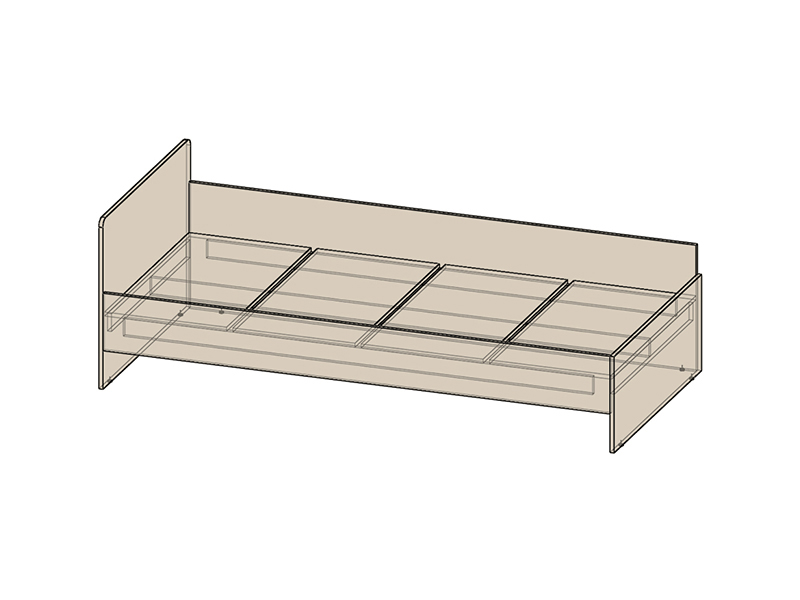 Одинарная кровать с фактурной окраской в теплом молочном цвете. Каркас изготовлен из ЛДСП толщиной 16 мм (кромка – ПВХ) и установлен на прямые устойчивые опоры. Кровать без бортиков с плоским основанием предполагает матрас не менее 18 см в высоту.
