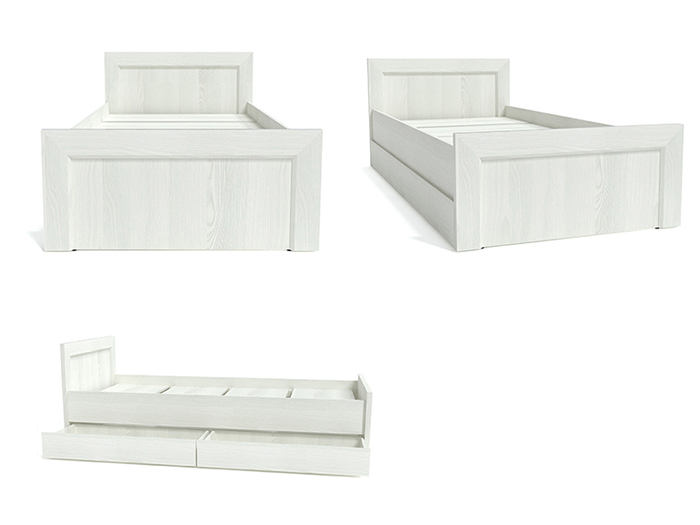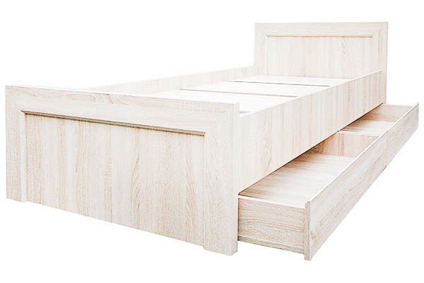 Каркас, изголовье и изножье, а также основание под матрас изготовлены из ЛДСП. Данная модель односпальной кровати комплектуется двумя просторными бельевыми ящиками. Монтаж ящиков возможен в любую сторону. Кровать также доступна в цвете «дуб сонома» и без бельевых ящиков в комплекте.