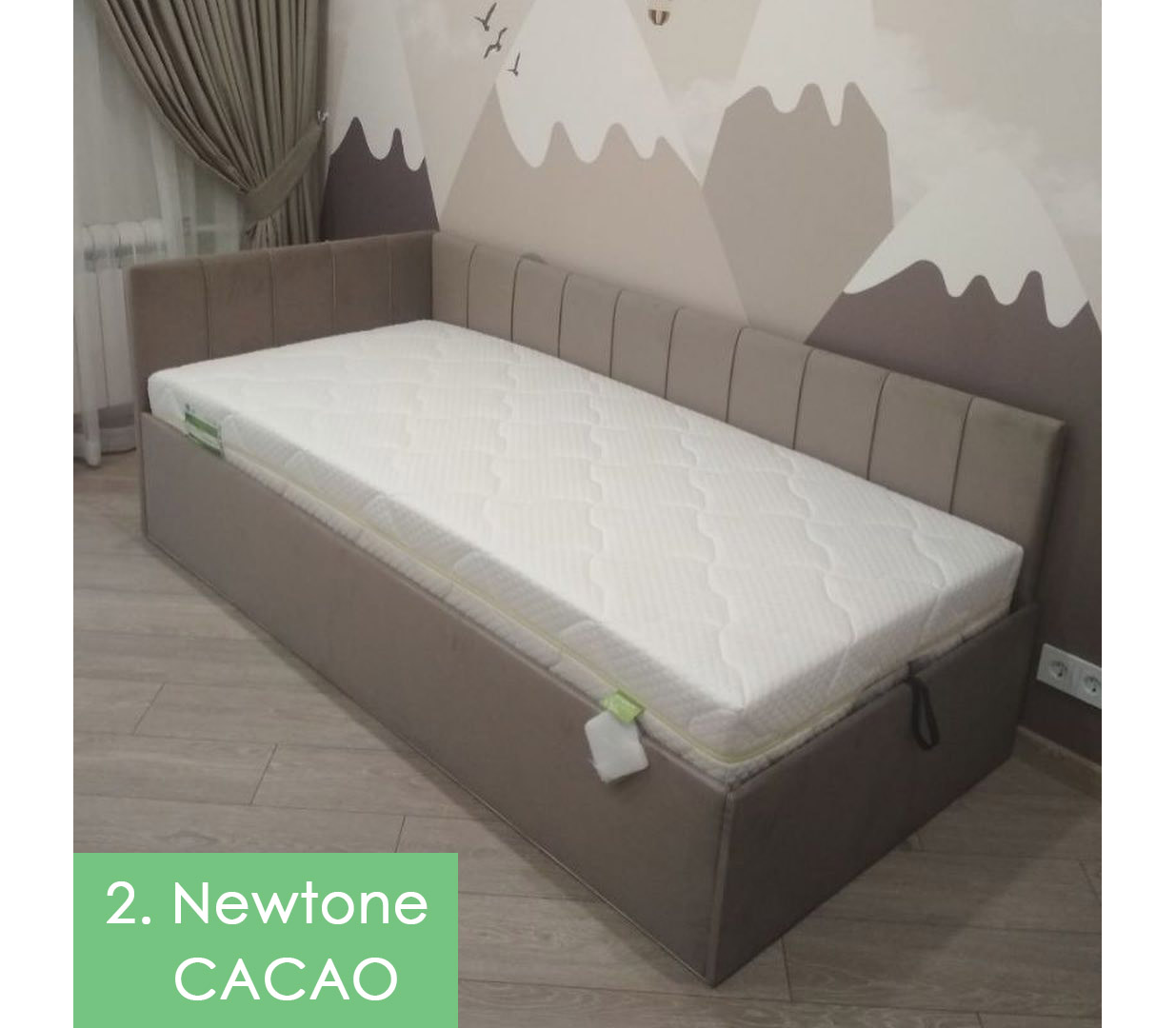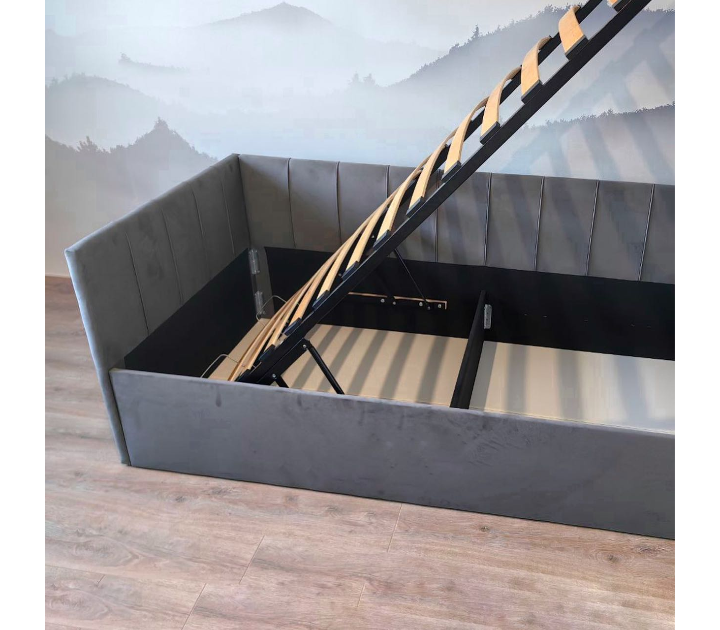 Кровать оборудована ортопедическим основанием и вместительным отделением для белья. Корпус обит мягким микровелюром, спинки украшены вертикальной простежкой — спать в такой кровати приятно, комфортно и безопасно.