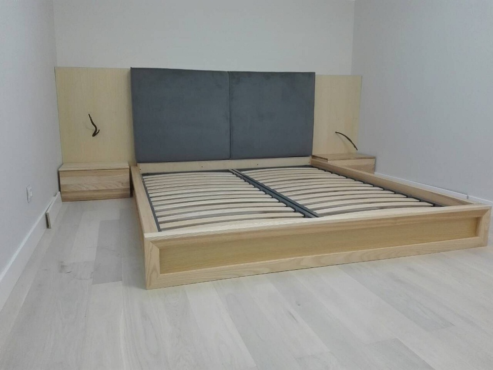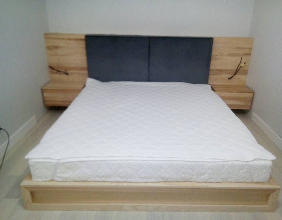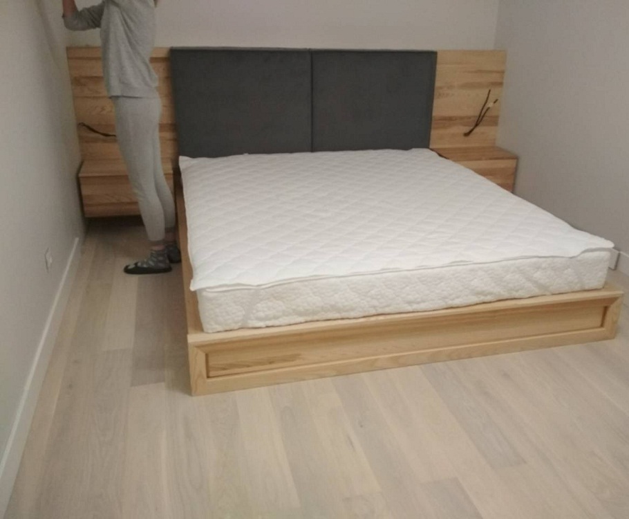Стильная двуспальная кровать выполнена из клееного бруса естественной расцветки. Прямоугольное изголовье средней высоты украшено мягкими накладками серого цвета и дополнено навесными прикроватными тумбами. Заниженный короб кровати изготовлен из рамочных панелей.