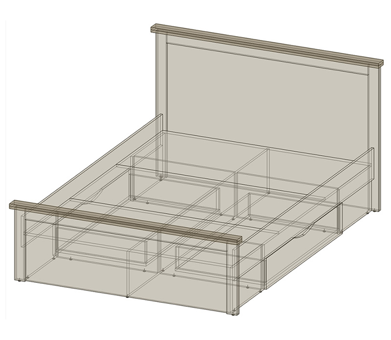 Кровать на два спальных мета изготовлена из ламинированной ДСП и оснащена выдвижными ящиками для белья. Конструкция имеет высокую спинку и бортики по краям, предотвращающие падение во время сна. Кровать поставляется в разобранном виде, в комплект входит всё необходимое для самостоятельной сборки.