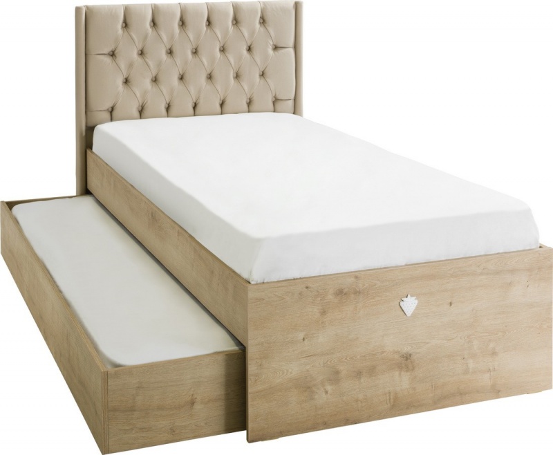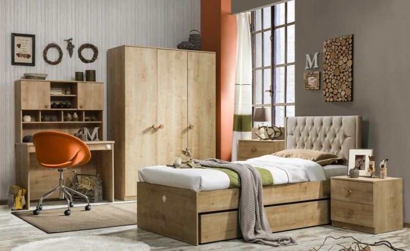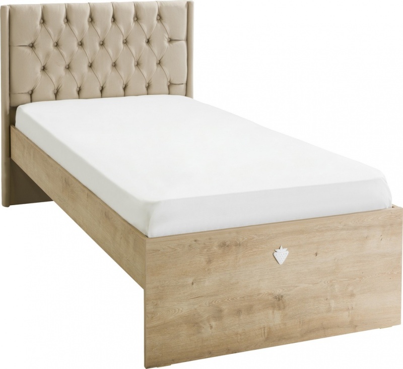 Односпальная кровать с лаконичным дизайном выполнена в оттенках натурального дерева. Мягкое изголовье декорировано стяжкой с пуговицами.