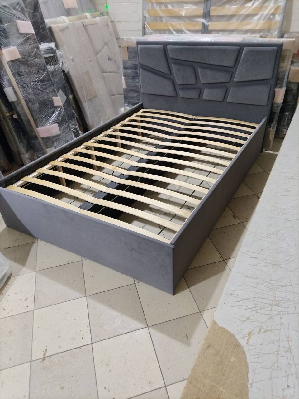 Современная кровать с мягким изголовьем и ламелями