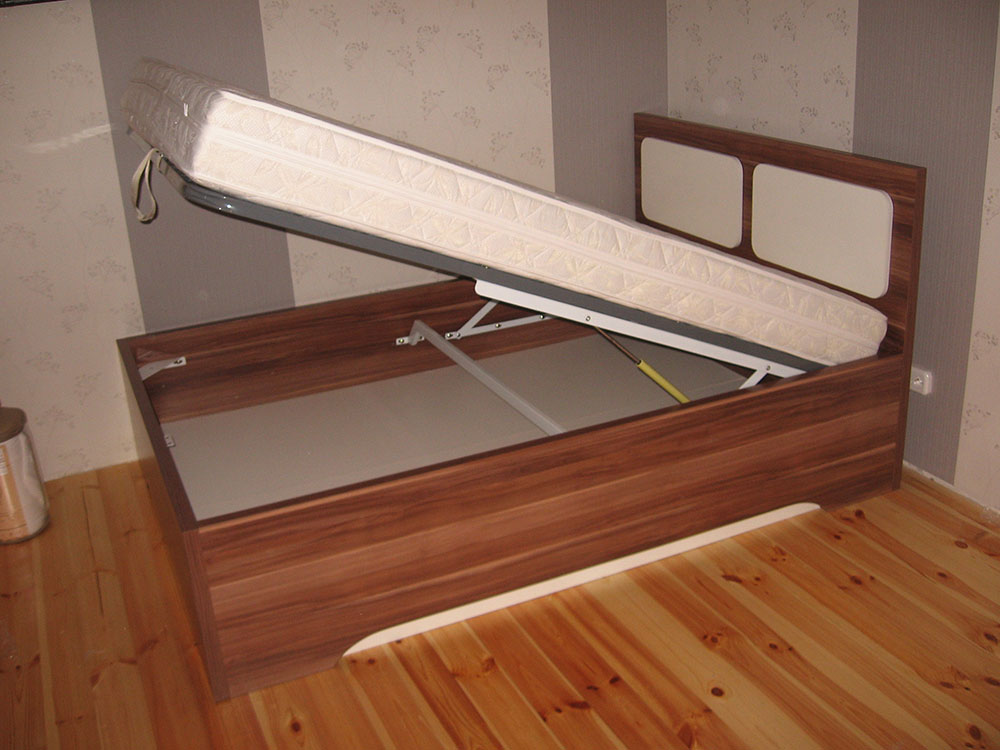 Широкая двуспальная кровать в корпусе под орех со светлыми накладками на прямоугольном высоком изголовье. Благодаря отсутствию ножной спинки и подьемному механизму легко доступна ниша для хранения под матрасом.