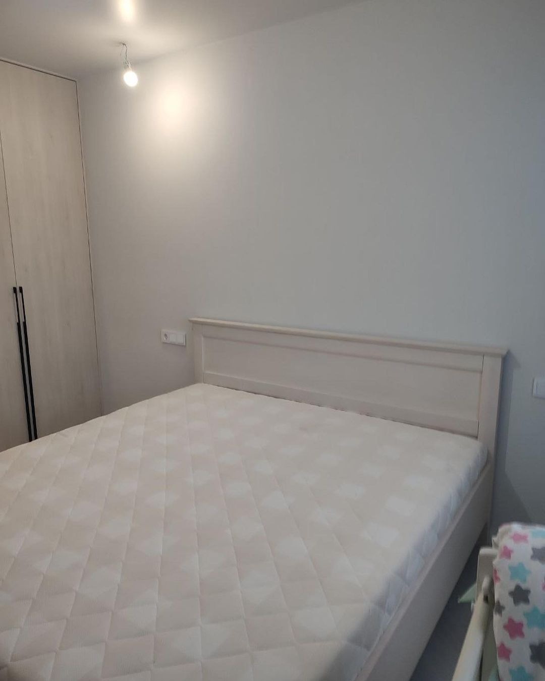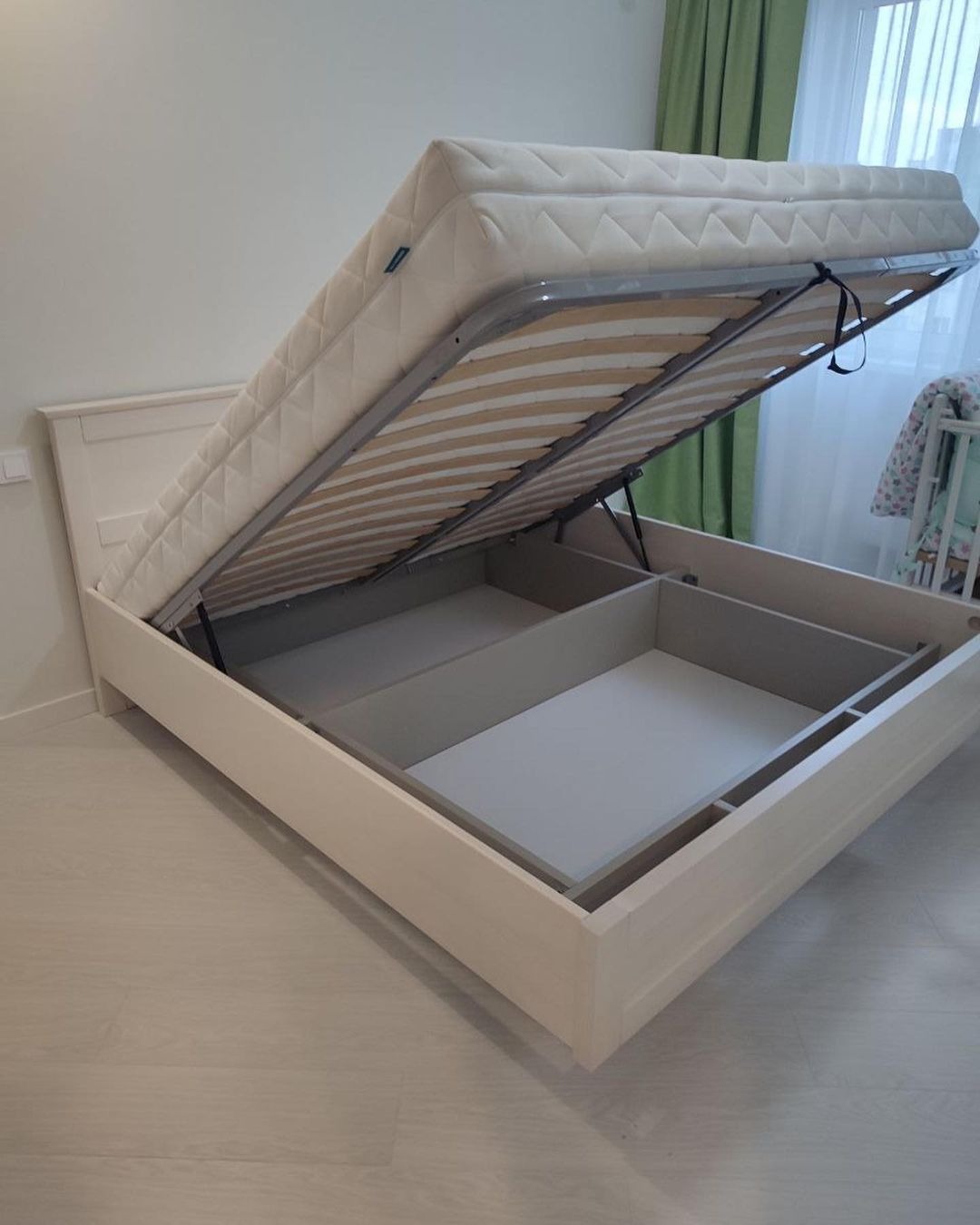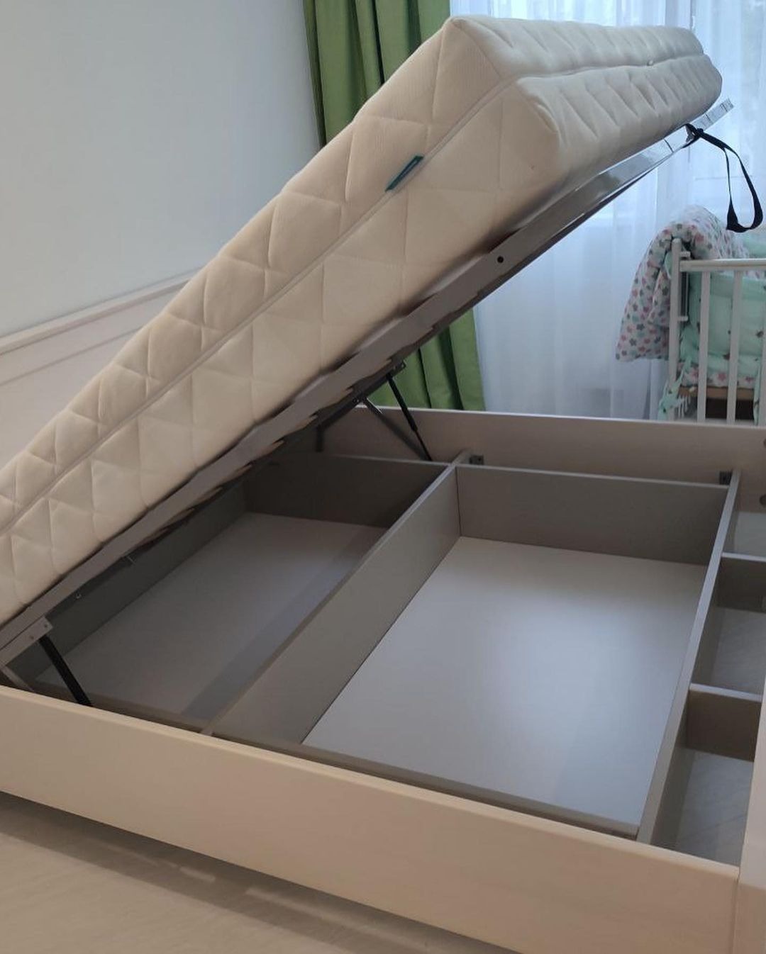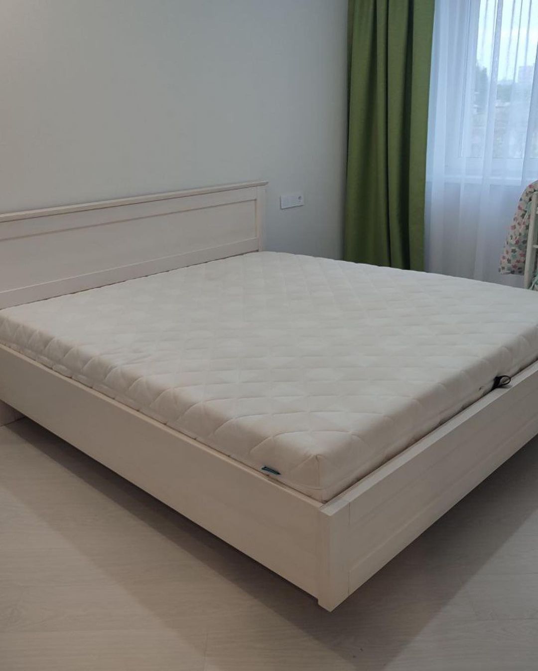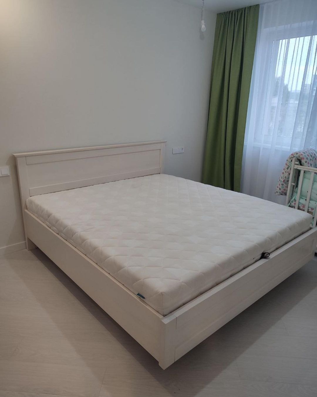Двуспальная кровать с ортопедическим основанием и мягким изголовьем.