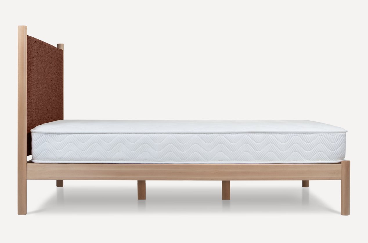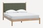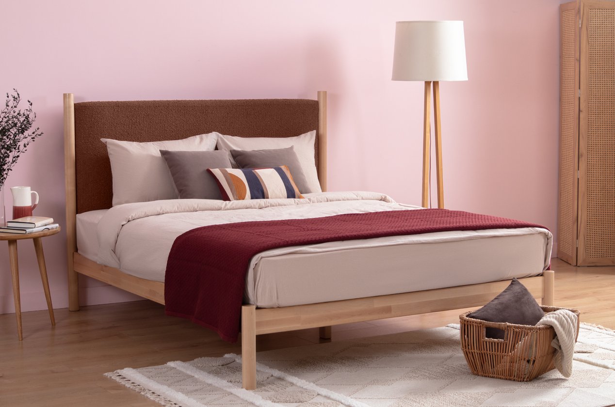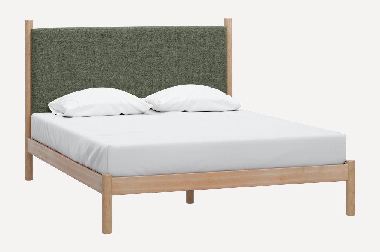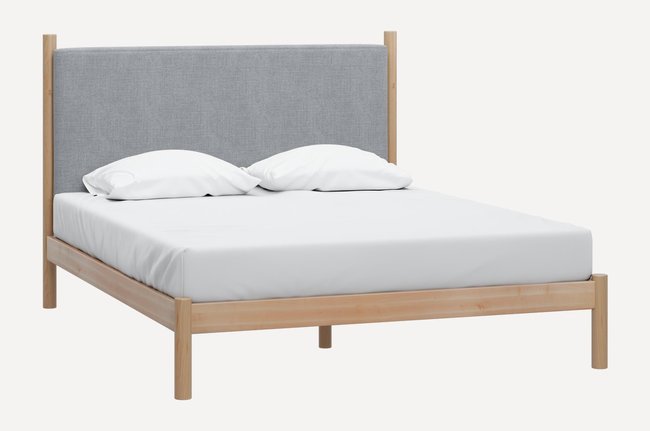 Мягкая кровать с двумя разными высокими изголовьями, которые создают иллюзию глубины.