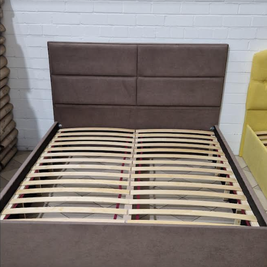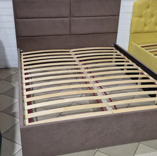 Современная двуспальная кровать с ортопедическим основанием и мягким изголовьем.