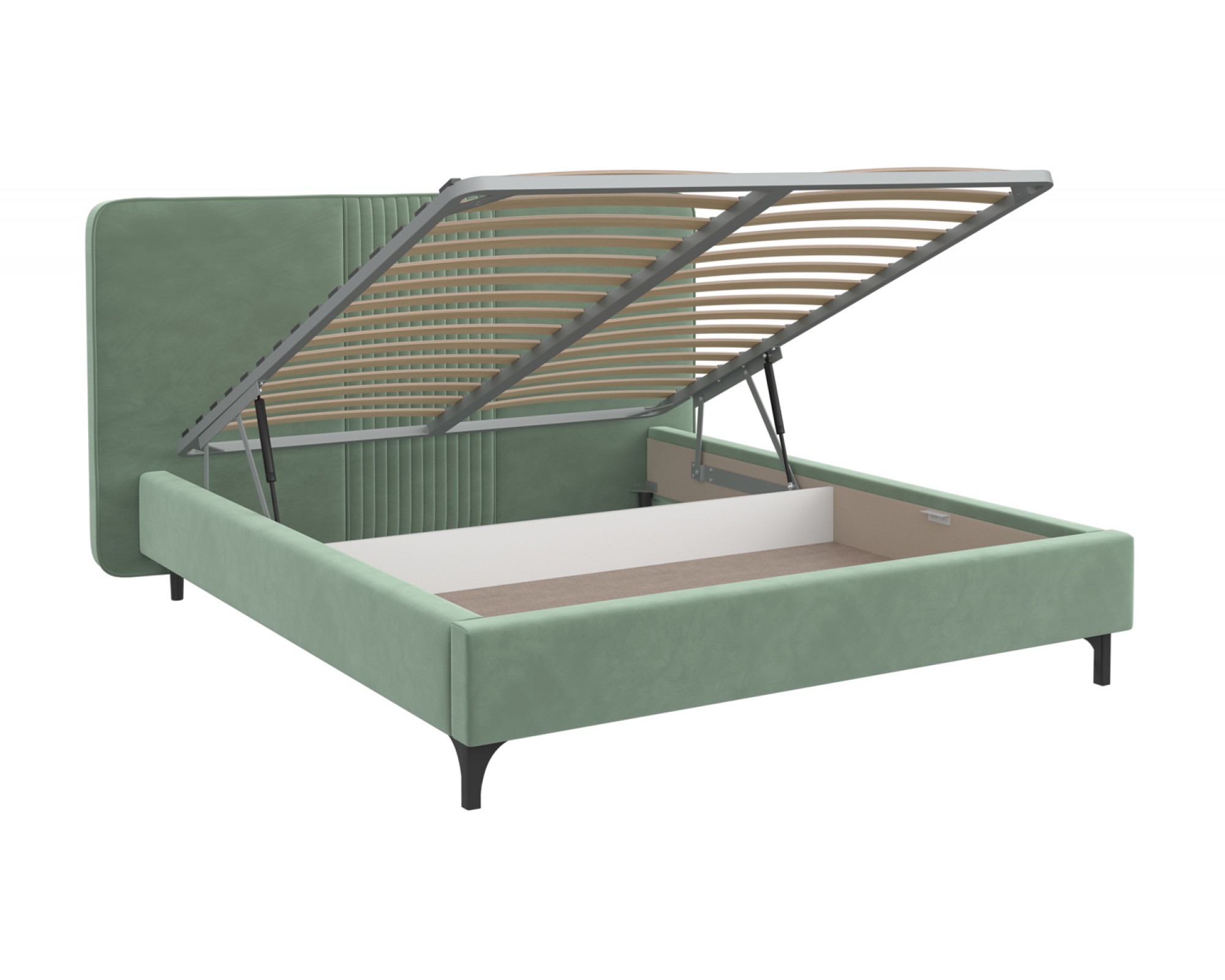 Изголовье кровати СТЕЛЛА-2 отдекорировано складками и выходит за боковые габариты кровати, это выглядит очень эффектно и современно. Визуальной лёгкости модели придают ножки-опоры из массива, которые приподнимают кровать от пола на 14 см, что с функциональной точки зрения очень удобно для уборки под кроватью. Кровать может комплектоваться металлокаркасом (вариант 1) или металлокаркасом с подъемным механизмом (газовым амортизатором (газлифтом)) (вариант 2). В случае выбора 2-го варианта основания спального места в кровати будет находиться бельевой ящик шириной 160 см, длиной 93,5 см и высотой 15 см.