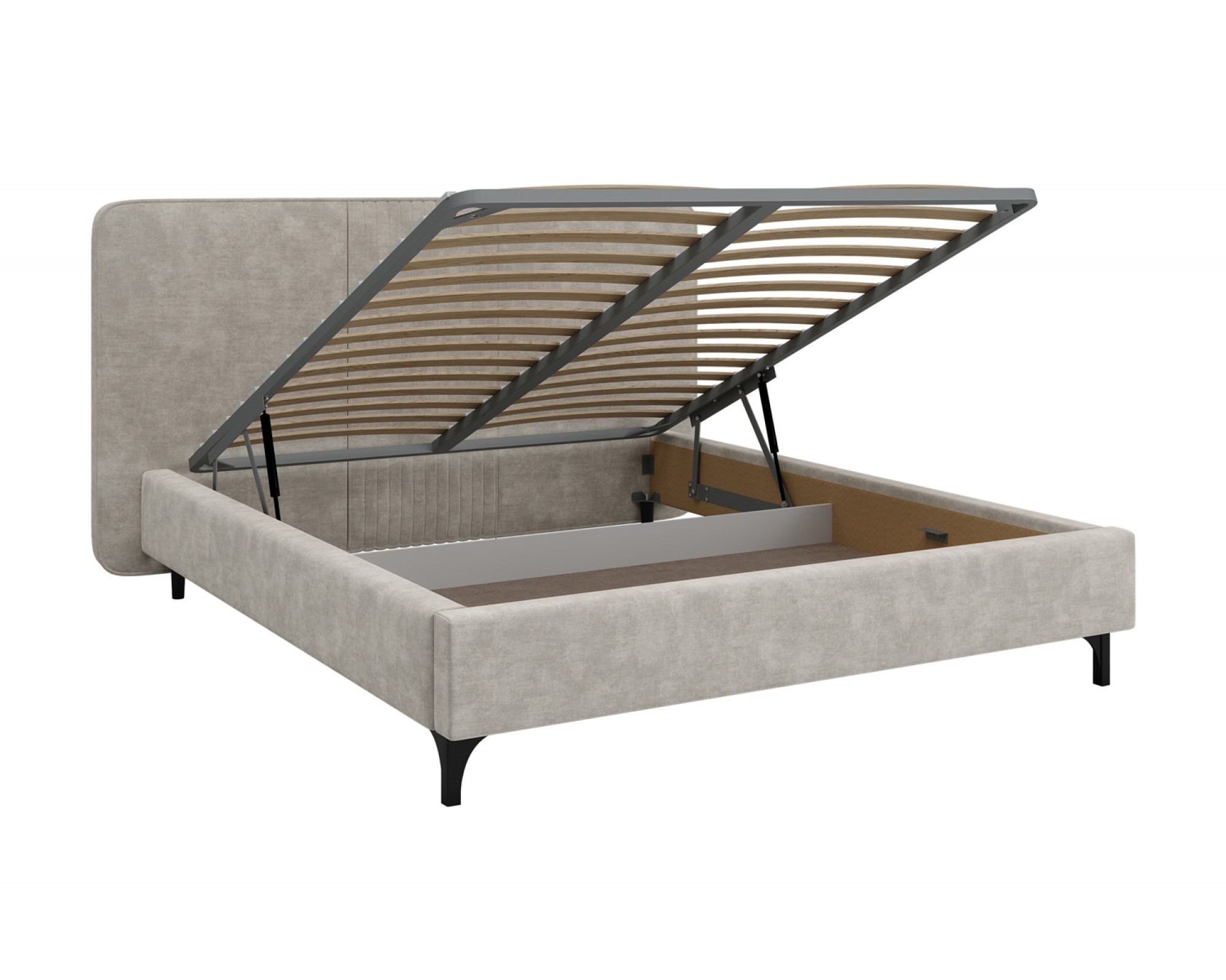 Изголовье кровати СТЕЛЛА-2 отдекорировано складками и выходит за боковые габариты кровати, это выглядит очень эффектно и современно. Визуальной лёгкости модели придают ножки-опоры из массива, которые приподнимают кровать от пола на 14 см, что с функциональной точки зрения очень удобно для уборки под кроватью. Кровать может комплектоваться металлокаркасом (вариант 1) или металлокаркасом с подъемным механизмом (газовым амортизатором (газлифтом)) (вариант 2). В случае выбора 2-го варианта основания спального места в кровати будет находиться бельевой ящик шириной 160 см, длиной 93,5 см и высотой 15 см.