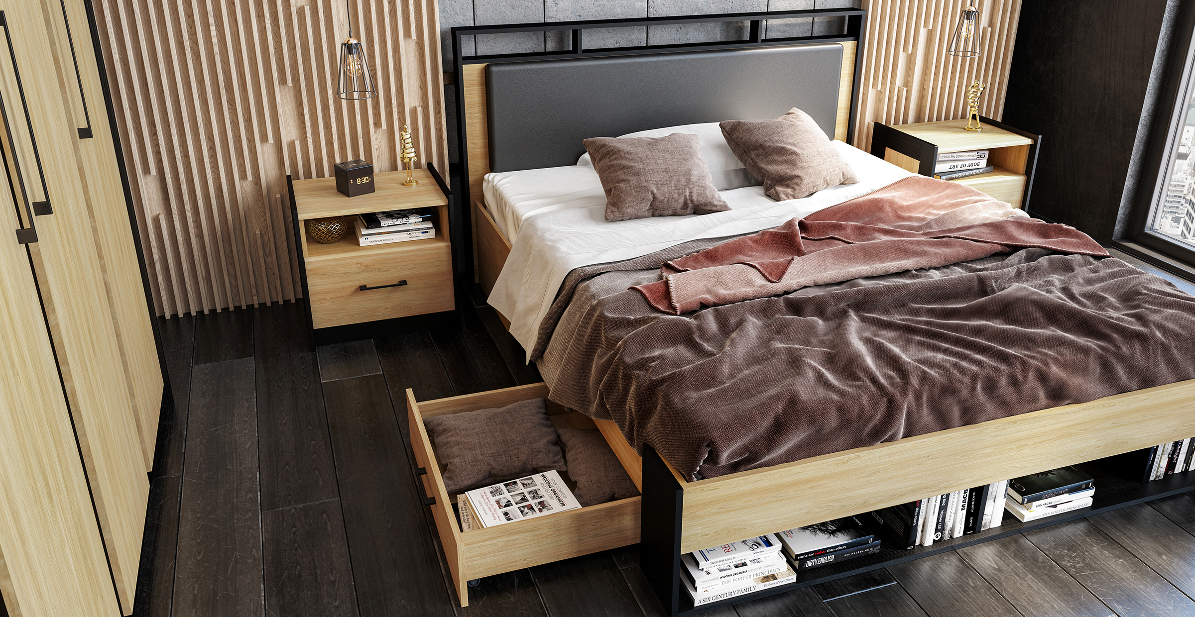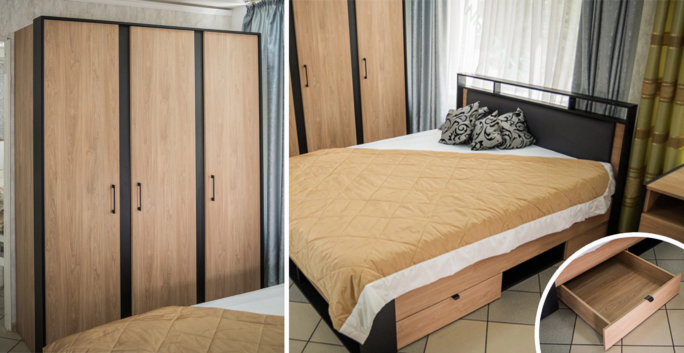 Спальное место: 180х200 см. Материал: МДФ покрытый плёнкой, ЛДСП.