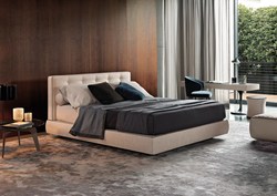 Элегантная кровать с декоративной обивкой: корпус и изголовье покрыто равномерно стеганой обивкой.