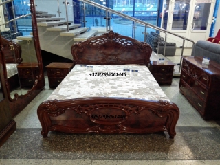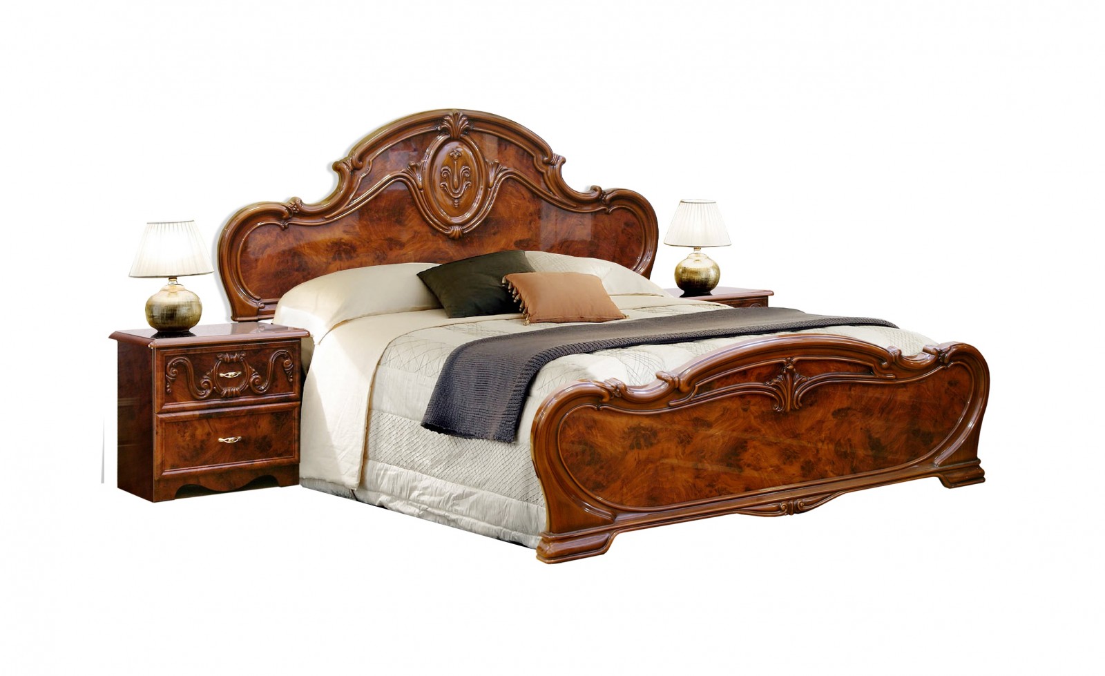 Роскошная кровать в барочном стиле с элементами ампира. Фигурные спинки с резьбой на фасаде, напоминающей художественную лепнину. Оригинальности добавляет расцветка под корень лесного ореха с ее неоднородной фактурой.