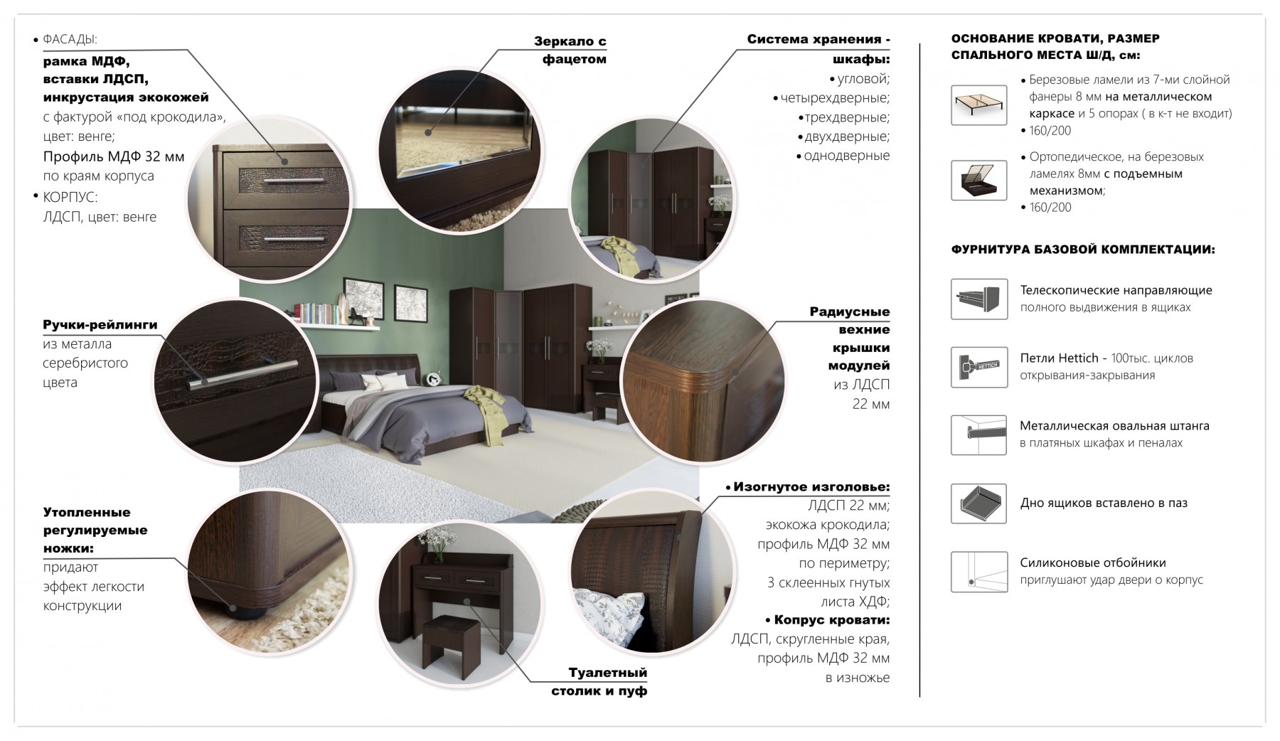 Спальное место: 160х200 см. Материал: ЛДСП, МДФ покрытый плёнкой.