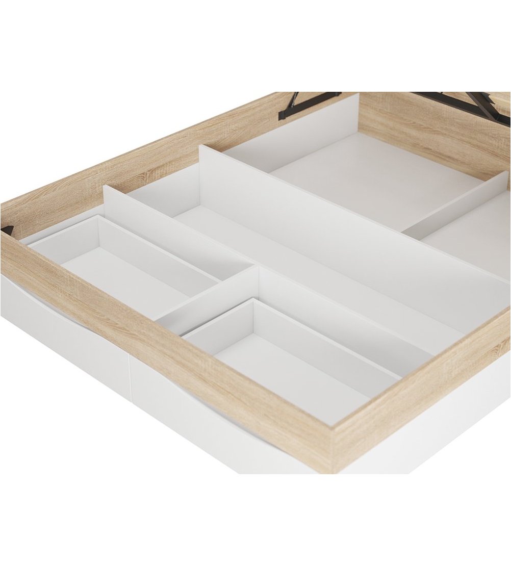 Спинка оборудована тумбочками для часов, светильников. На полках подиума можно хранить вещи.