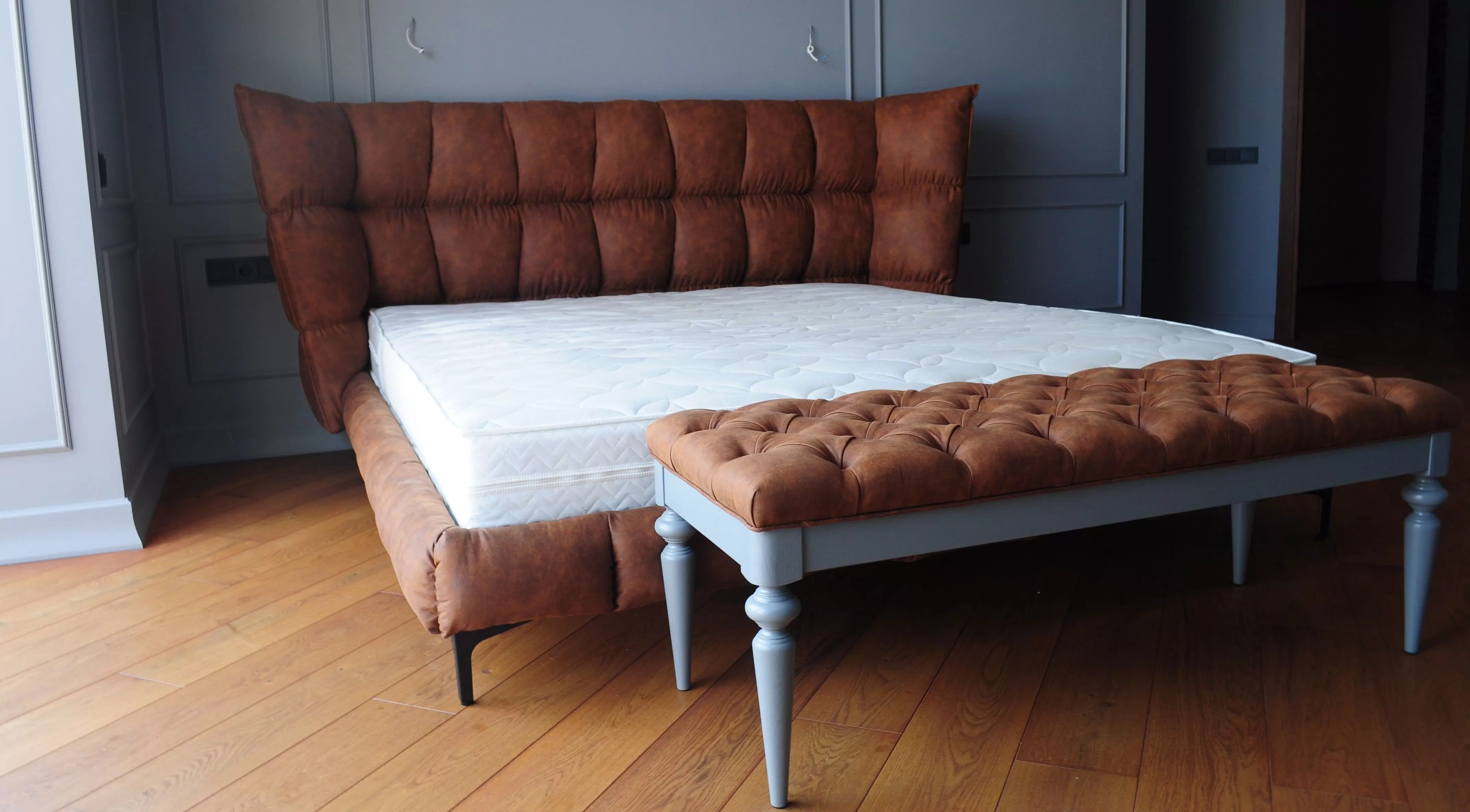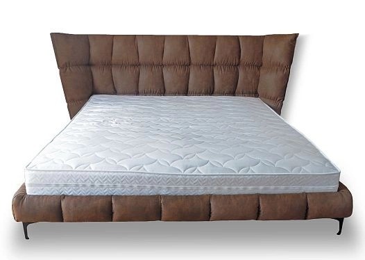 Оформление мягкого изголовья, царг и изножья кровати выполнено утопленным декоративным швом, формирующим множество геометрических фигур в виде неправильной формы прямоугольников. Материал обивки подбирается индивидуально.