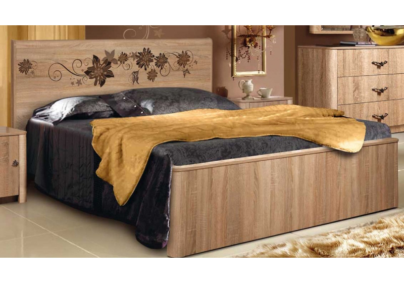Стильный и неповторимый дизайн кровати «Венеция» характеризуется очень плавными и элегантными линиями, которые не оставят равнодушным ни одного ее обладателя. Двуспальная конструкция изготовлена из высококачественного ламинированного ДСП, который характеризуется превосходными прочностными характеристиками вне зависимости от микроклимата помещения. Высокое изголовье кровати декорировано изящной инкрустацией в виде цветов. Фасад кровати имеет очень приятный рисунок благородных пород дерева в цвете светлый ясень.