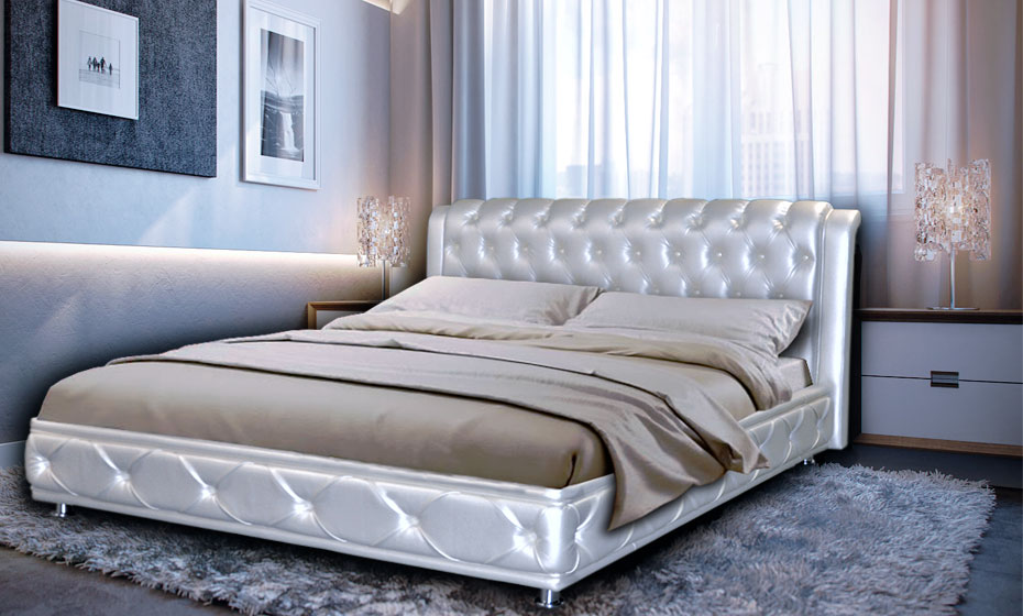 Оригинальная кровать «Венеция» изготовлена из надежных материалов с инкрустацией в виде небольших пуговиц, составляющий неординарный и яркий дизайн кровати. Модель отлично подойдет для небольших спален, поскольку создает визуальную массивность, тем самым расширяя пространство. Ножки хромированные, органично вписывающиеся в дизайнерский концепт кровати. Спальное место просторное, идеально подходящее для любителей комфортного сна и отдыха.