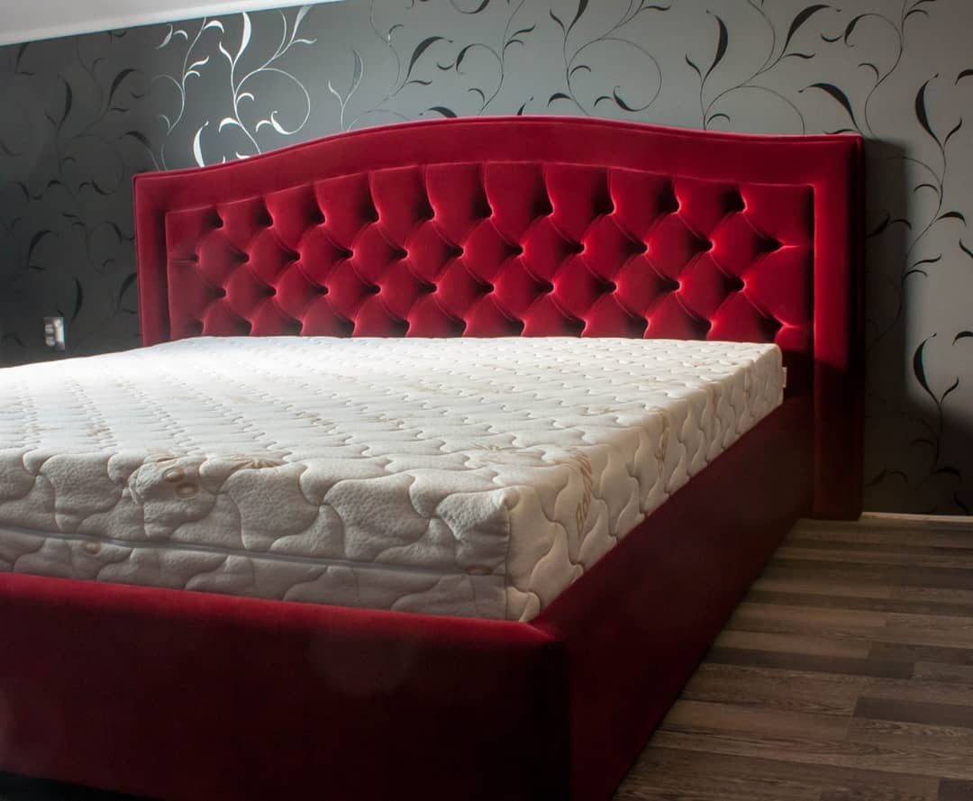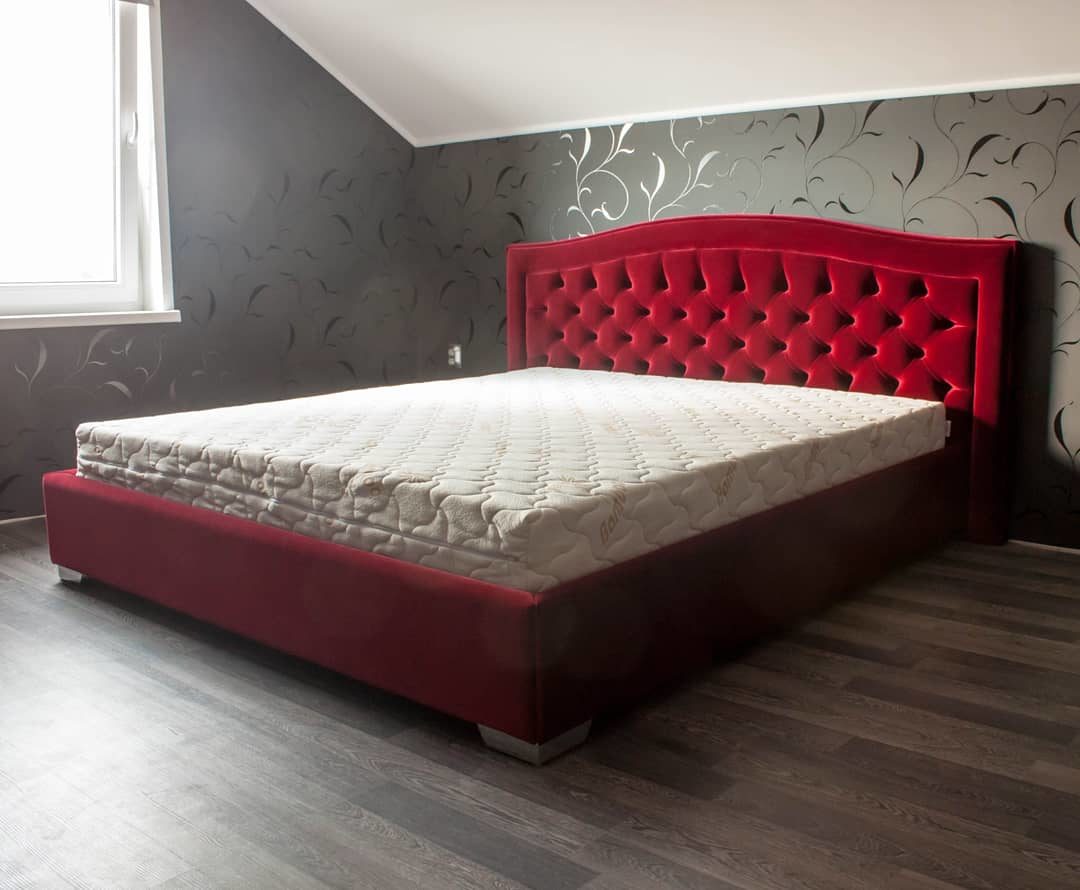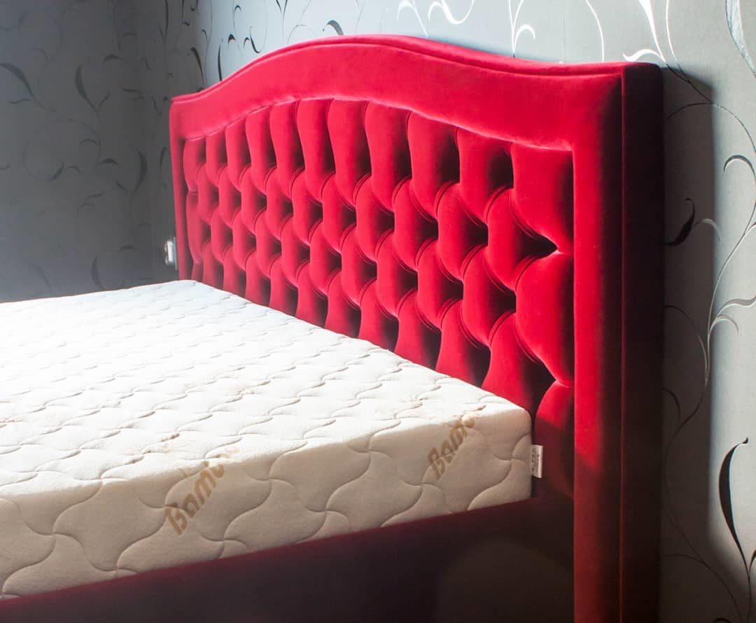 Мягкая кровать с двумя разными высокими изголовьями, которые создают иллюзию глубины.